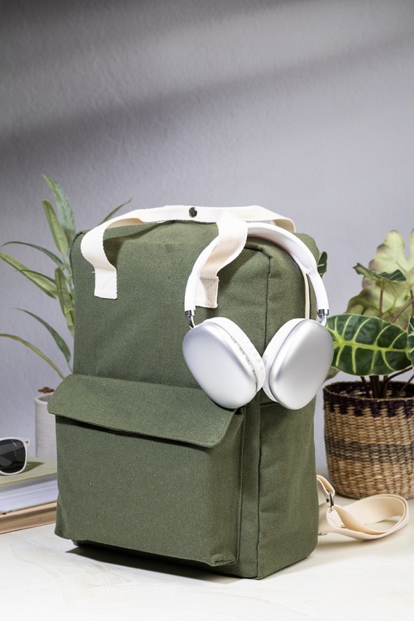 Rucsac din pânză reciclată, cu compartiment principal cu fermoar, compartiment căptușit pentru laptop (13") și buzunar frontal cu închidere cu velcro. 70% bumbac reciclat și 30% poliester RPET. Cu etichetă distinctivă din bumbac reciclat.