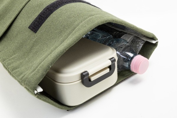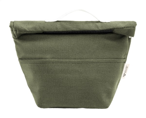 Geantă frigorifică, roll-top, din pânză reciclată, cu buzunar frontal, căptușeală din aluminiu și închidere cu velcro. 70% bumbac reciclat și 30% poliester RPET. Cu etichetă distinctivă din bumbac reciclat.