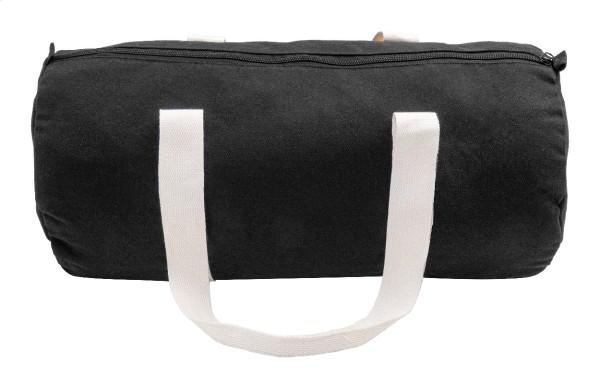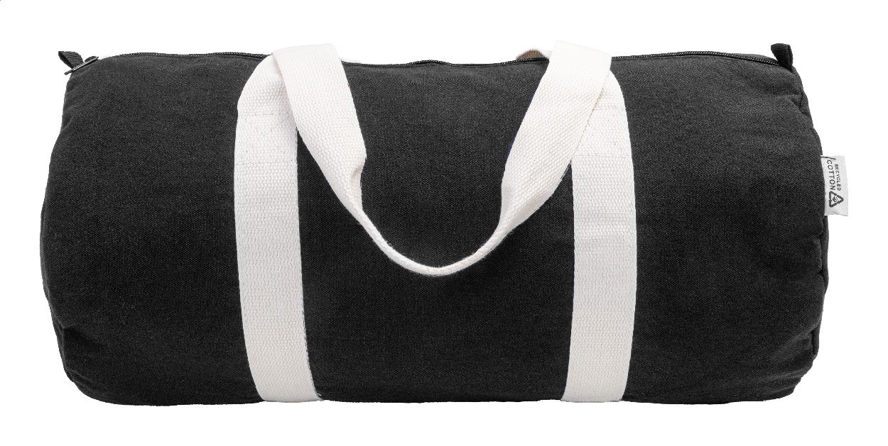 Geantă sport din pânză reciclată, cu compartiment principal cu fermoar, buzunar interior cu fermoar și mânere lungi. 70% bumbac reciclat și 30% poliester reciclat. Cu etichetă distinctivă din bumbac reciclat.