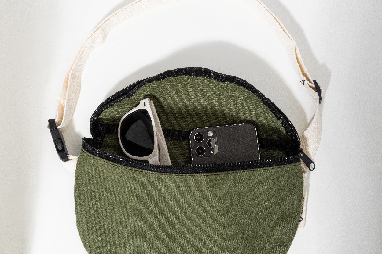 Borsetă din pânză reciclată, cu compartiment cu fermoar și curea reglabilă. 70% bumbac reciclat și 30% poliester reciclat. Cu etichetă distinctivă din bumbac reciclat.
