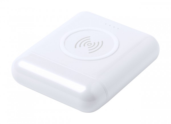 Bancă de alimentare USB din plastic cu baterie de 5000 mAh, încărcător wireless încorporat (5W) și căști stereo wireless adevărate (TWS) cu funcție de apelare mâini libere. Port de intrare USB-C. Inclusiv cablu de încărcare USB.