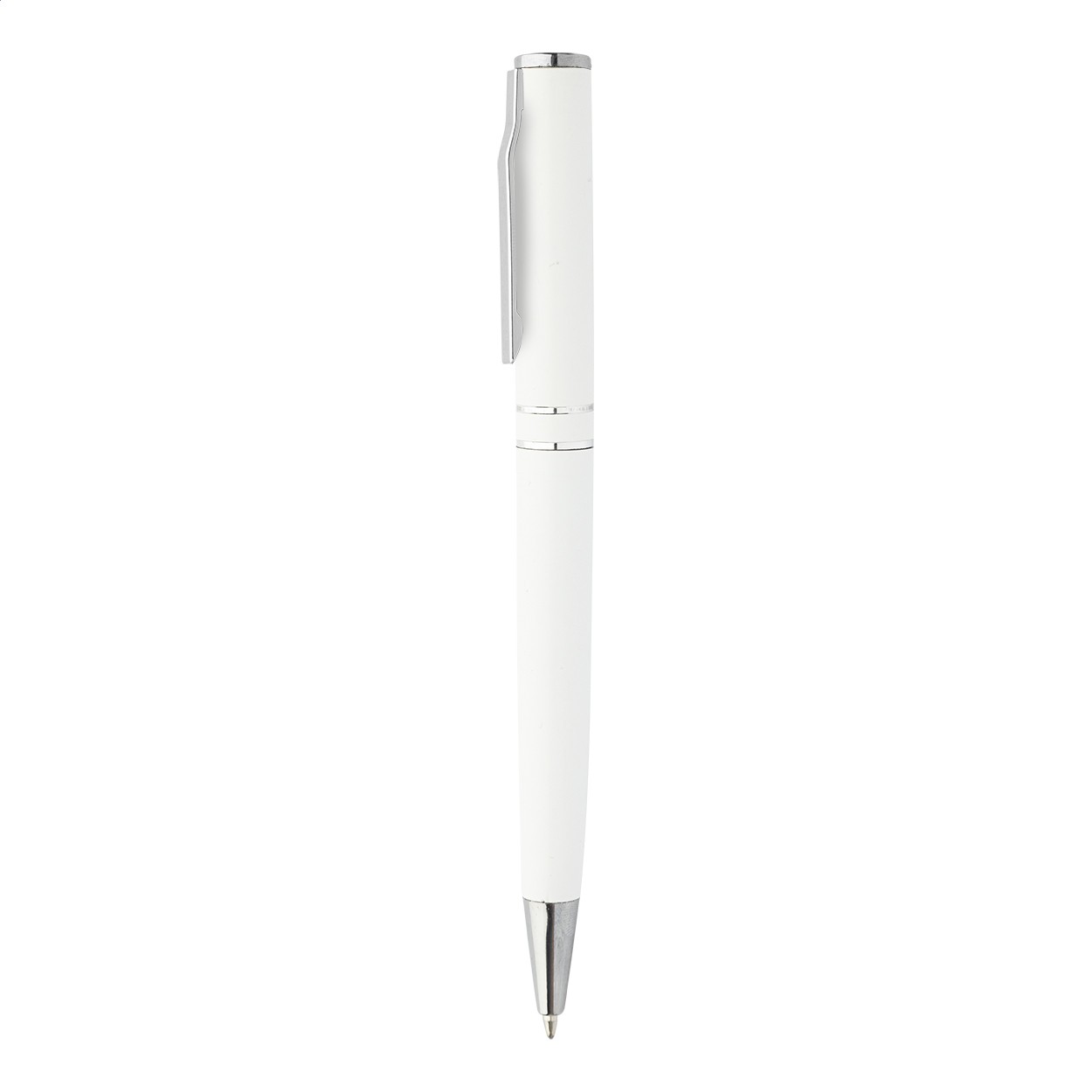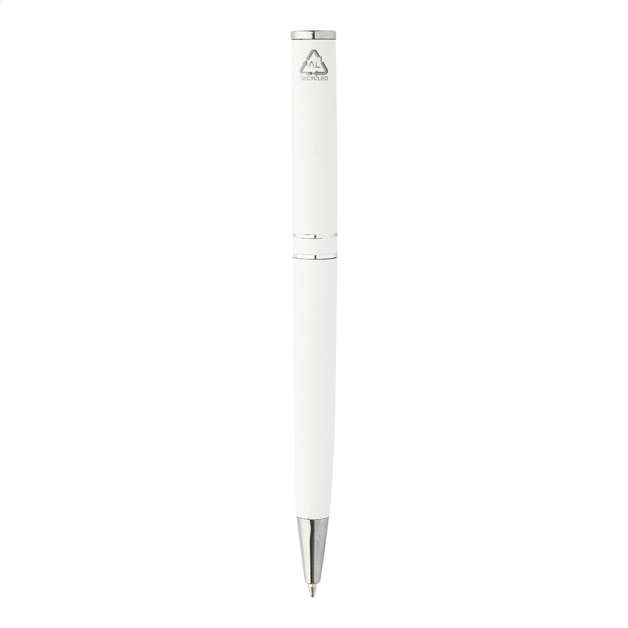 Pix cu bilă, din aluminiu reciclat, cu piese și inele cromate. În cutie cadou neagră. Cu mină albastră.