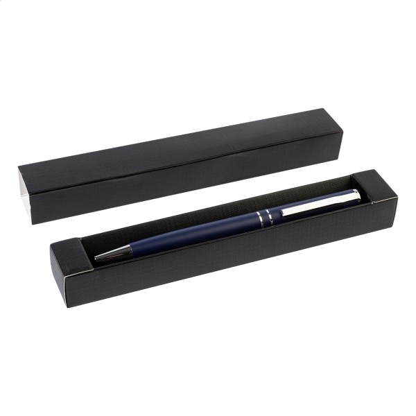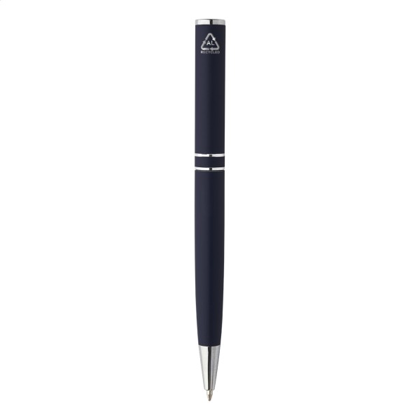 Pix cu bilă, din aluminiu reciclat, cu piese și inele cromate. În cutie cadou neagră. Cu mină albastră.