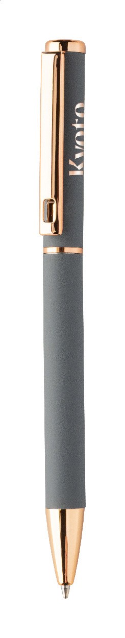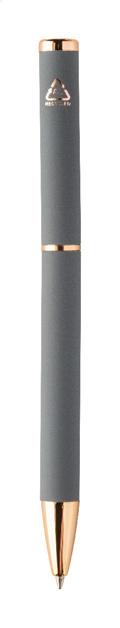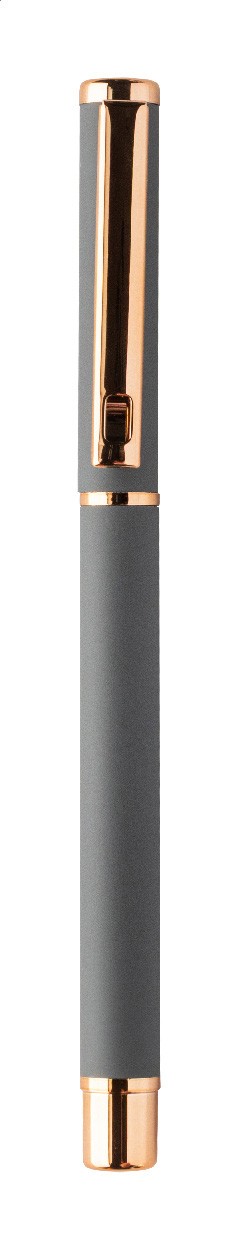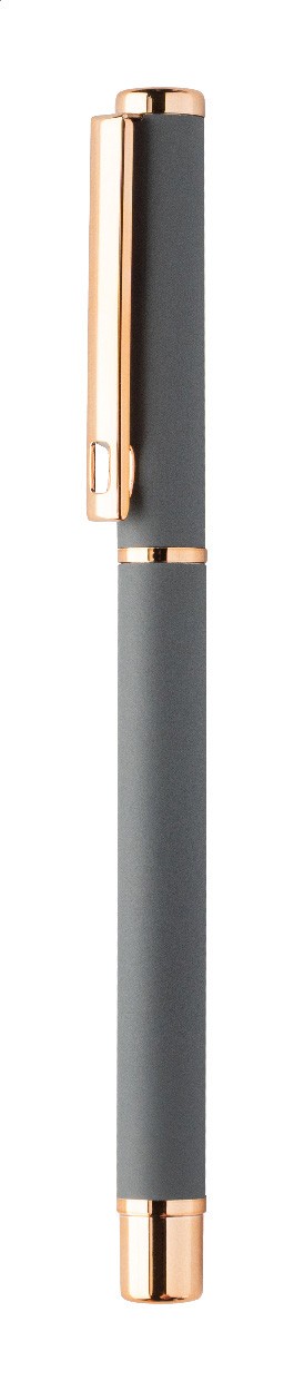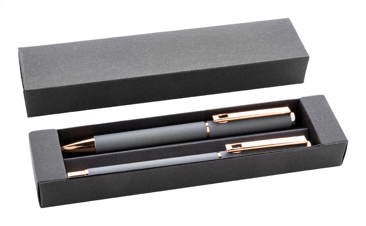 Set pixuri din aluminiu reciclat, cu pix cu bilă și roller, cu finisaj cauciucat și detalii auriu-roz. Cu mină albastră. Cu strat special pentru gravare laser în oglindă, de culoare auriu-roz. În cutie cadou din hârtie neagră.
