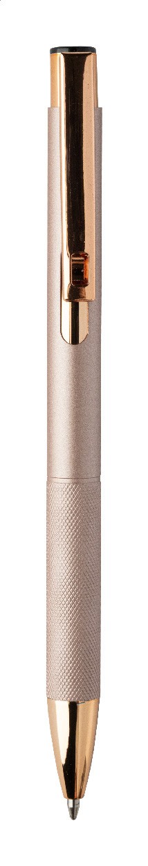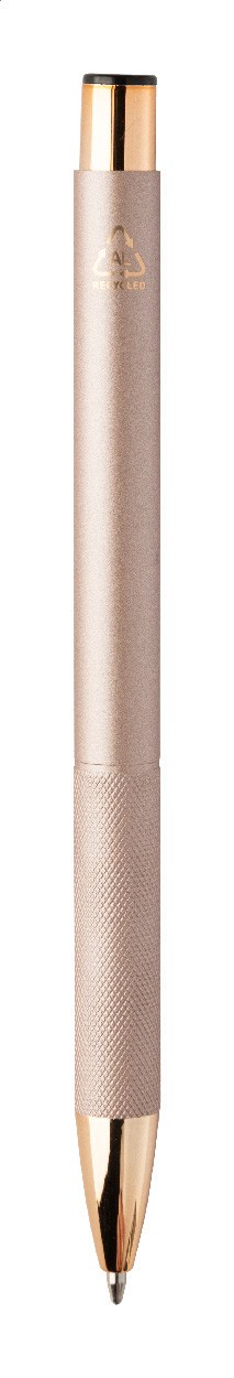 Pix din aluminiu reciclat, cu corp cu finisaj mat, grip texturat și detalii auriu-roz. Cu strat special pentru gravare laser în oglindă, de culoare auriu-roz. Cu mină albastră.