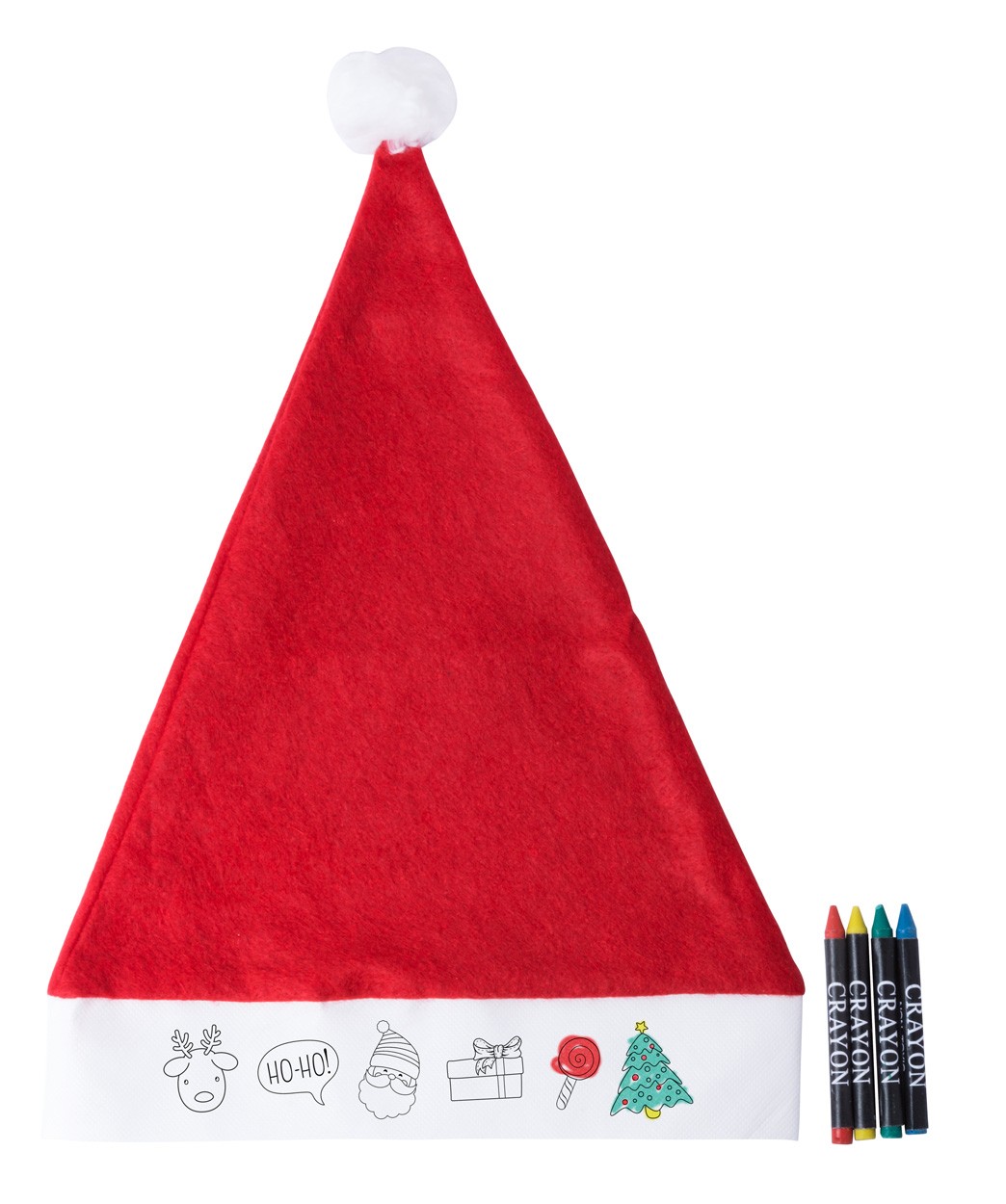 Căciula Mos Crăciun de colorat din poliester/non-woven cu 4 creioane de colorat.
