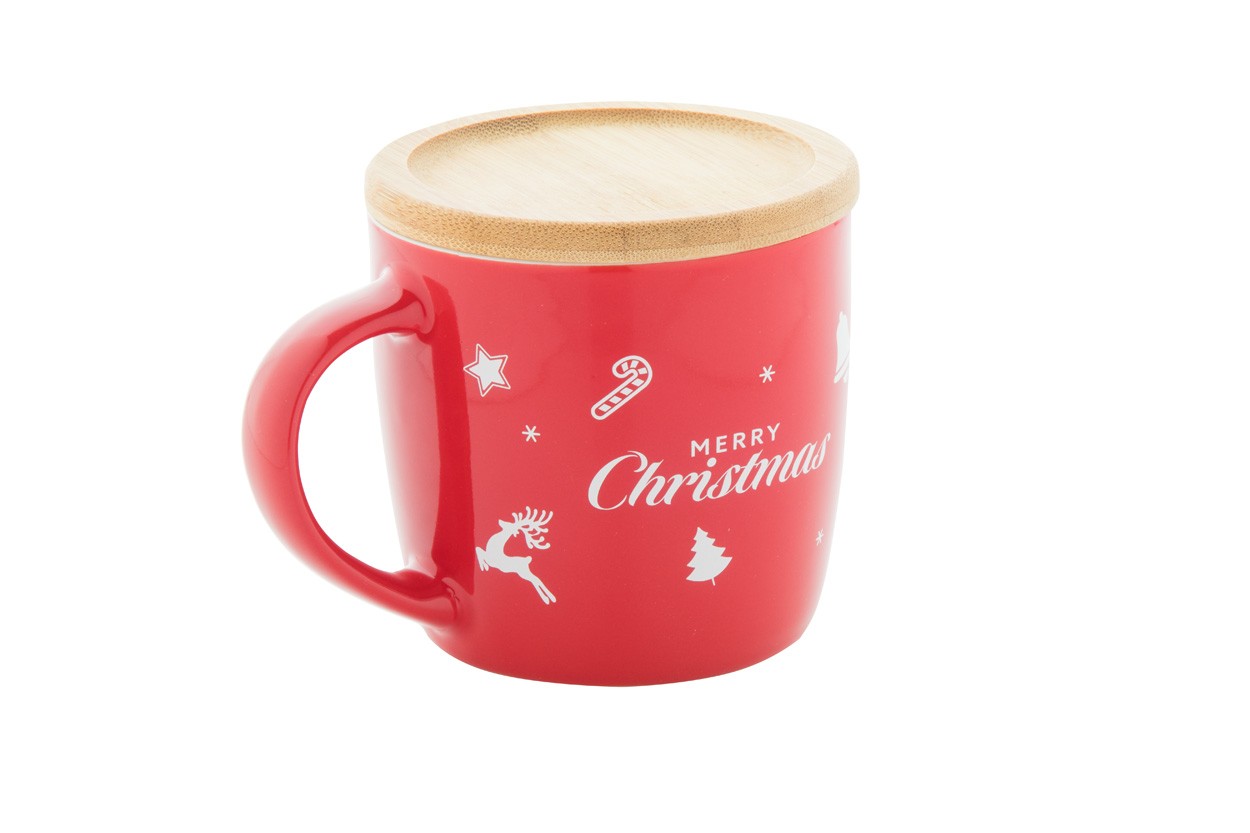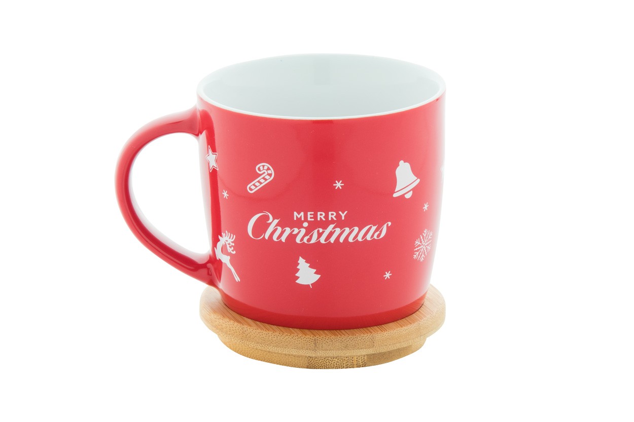 Cană din ceramică de înaltă calitate, cu coaster din bambus și design de Crăciun, 370 ml. În cutie de hârtie kraft.