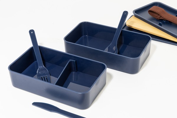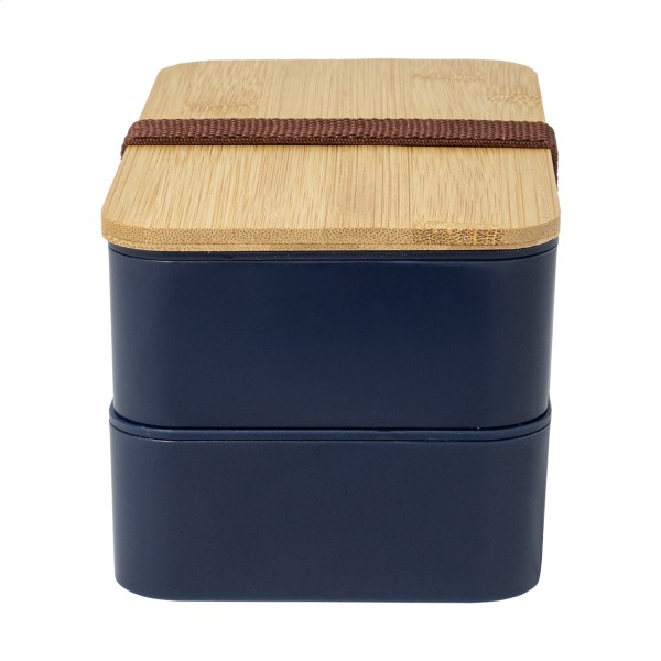 Cutie de prânz din plastic PP cu set de tacâmuri (furculiță, lingură și cuțit), capac din bambus și curea elastică. Cu 2 compartimente cu o capacitate de 700 ml fiecare.