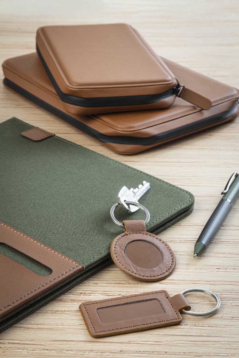 Breloc rotund, din piele PU reciclată, cu inel metalic și placă cu logo din oțel inoxidabil cu finisaj cauciucat. Cu acoperire specială pentru gravare cu laser în oglindă.