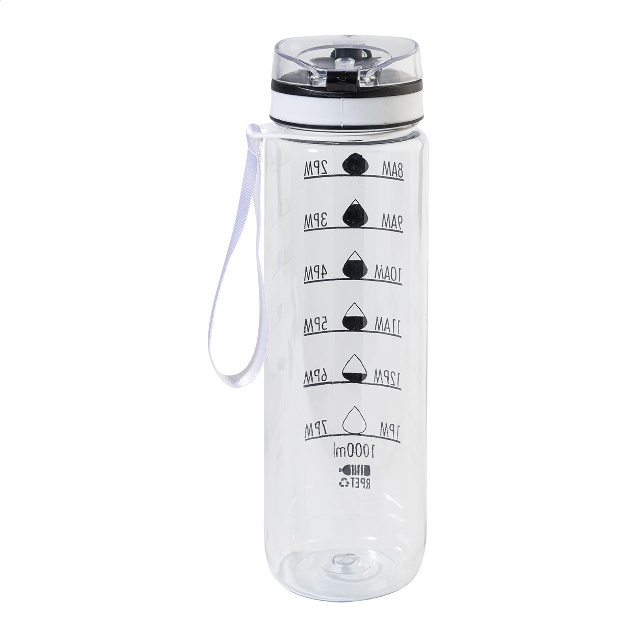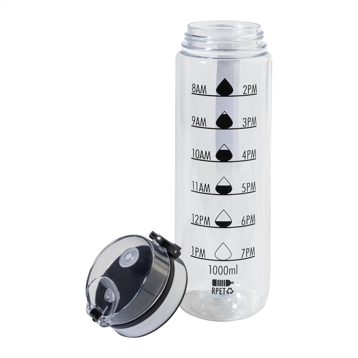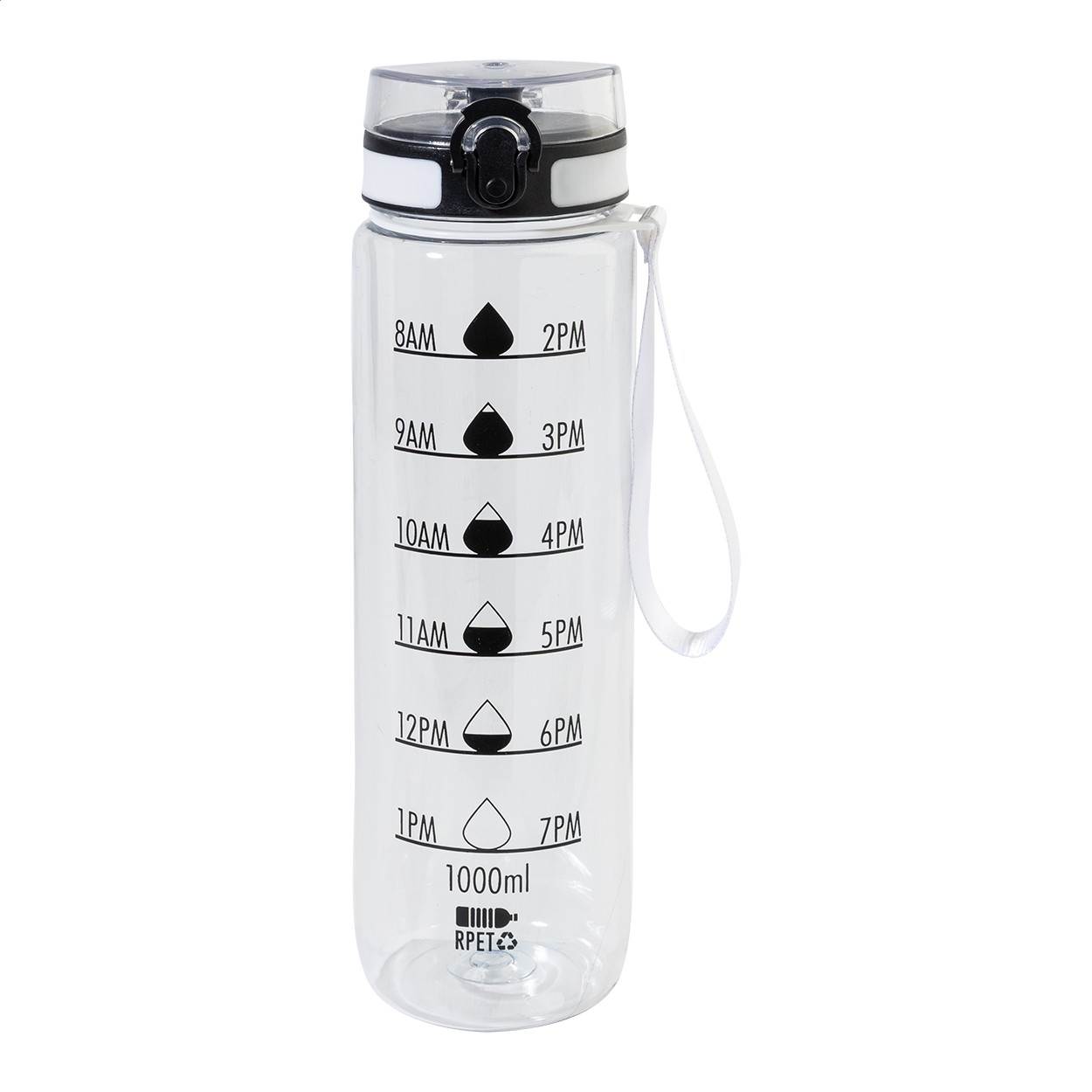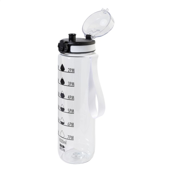 Sticlă sport, din RPET, mată, cu marcaje motivaționale pentru volum și timp, prevăzută cu capac flip-top cu deschidere automată, blocare de siguranță și curea de transport. 1000 ml. Fără BPA. Nu este potrivită pentru băuturi carbogazoase.