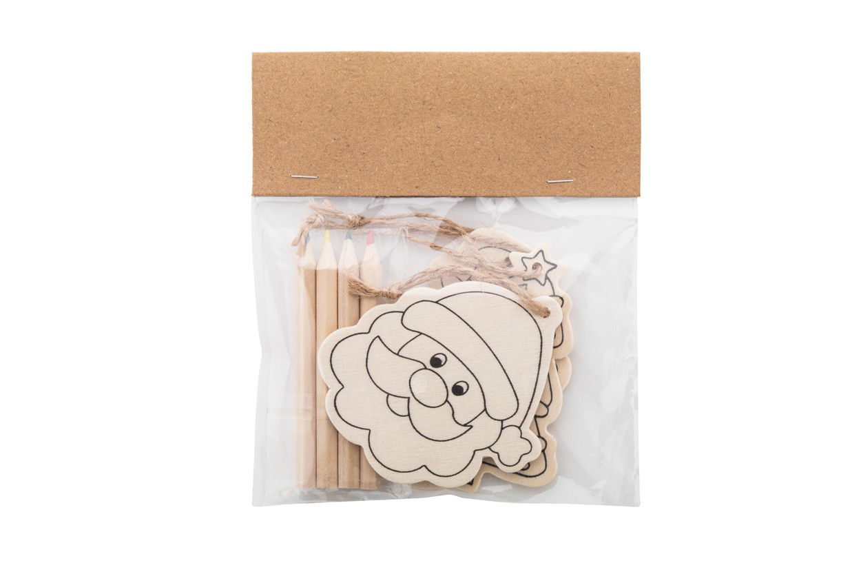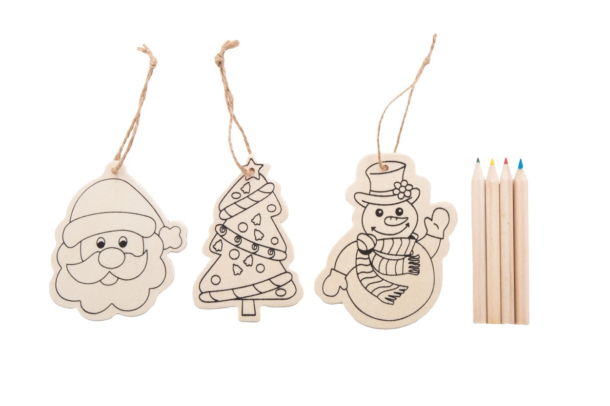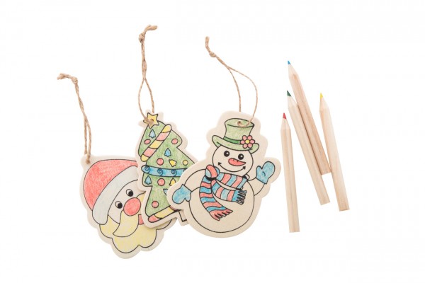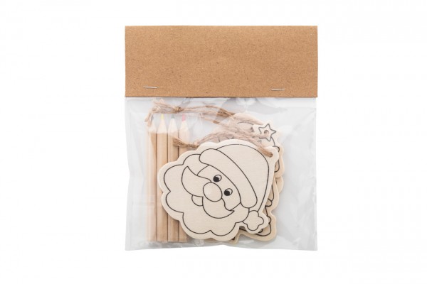 Set de ornamente pentru brad, de colorat, cu card de antet din hârtie kraft. Include 3 buc ornamente din lemn cu șnur de cânepă (Moș Crăciun, brad și om de zăpadă) și 4 buc creioane color.