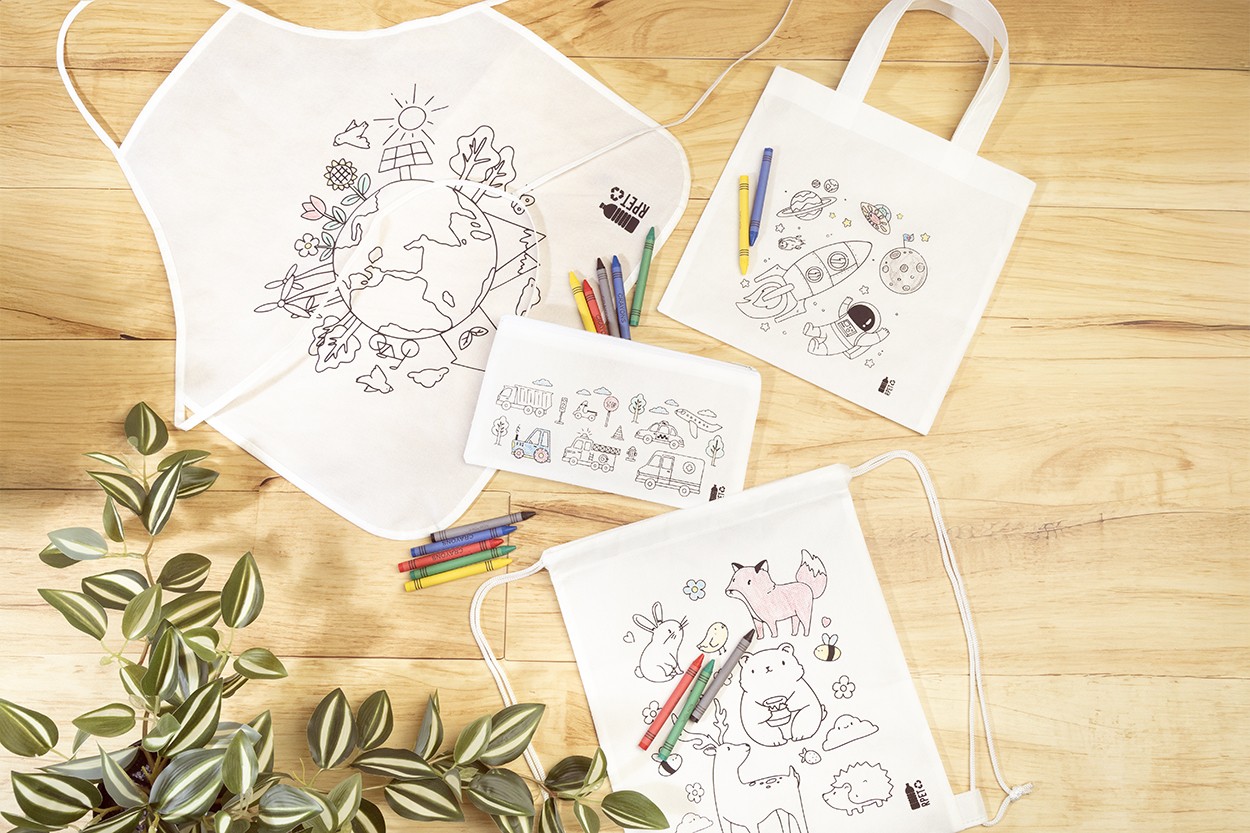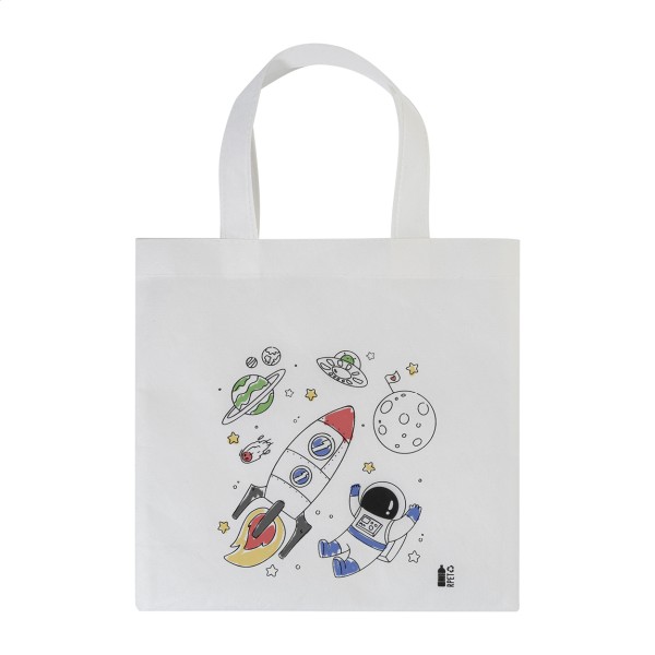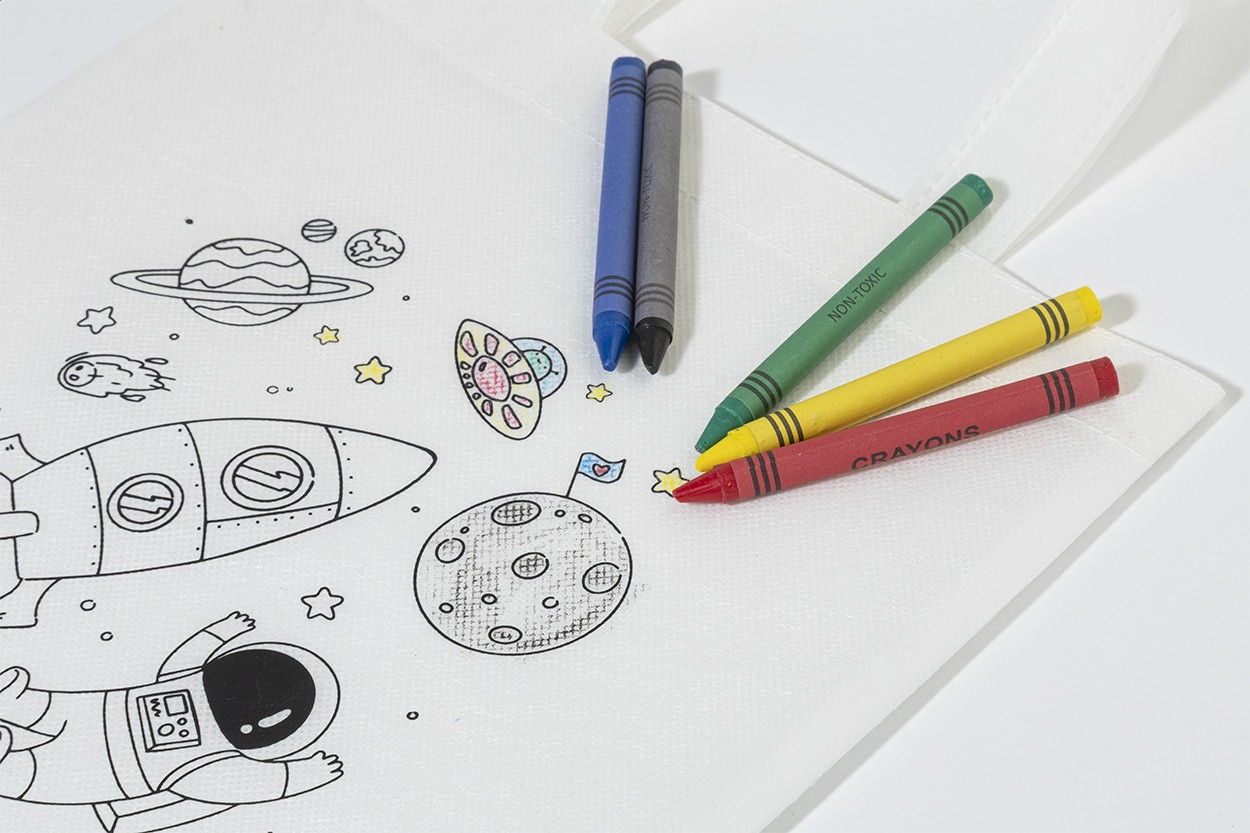 Sacoșă mini de cumpărături, de colorat, din material nețesut RPET, cu 5 creioane colorate