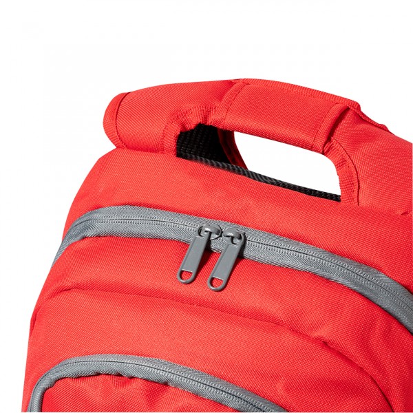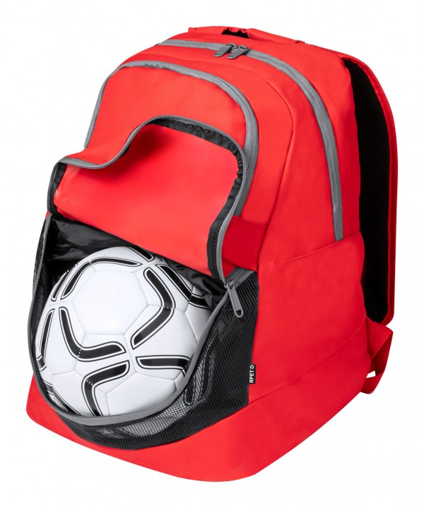 Rucsac RPET, cu buzunare principale și frontale cu fermoar, compartiment pentru pantofi, din plasă, mâner căptușit, bretele pentru spate și umăr. Poliester 600D RPET cu etichetă distinctivă RPET.