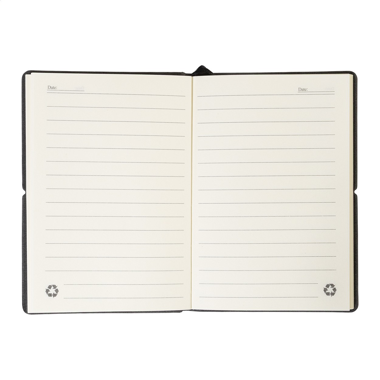 Caiet cu copertă din piele PU reciclată, cu 70 de file dictando, din hârtie reciclată, 25 de bilețele adezive și 125 de marcaje de pagină (în 5 culori diferite). Cu semn de carte și curea orizontală din cauciuc. Dimensiune A6.