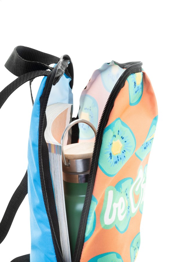 Mini rucsac RPET, personalizat, cu compartiment cu fermoar. Cu grafică imprimată prin sublimare. Poliester 600D RPET cu etichetă distinctivă RPET. MOQ: 25 buc.