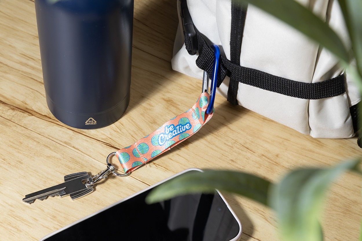 Mini breloc personalizat, din poliester RPET, cu grafică imprimată prin sublimare pe ambele părți. Cu carabine mici din metal și mari din aluminiu reciclat. Cantitate minimă de comandă: 100 bucăți.