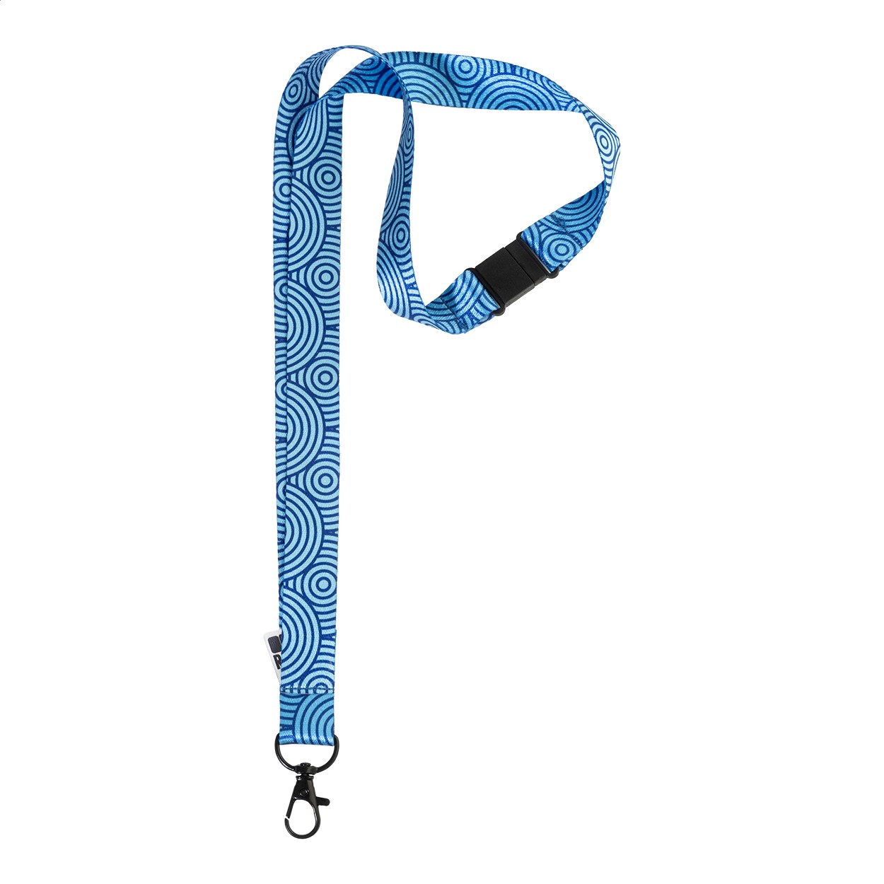 Lanyard RPET personalizat, cu carabină metalică colorată și cataramă de siguranță. Cu grafică imprimată prin sublimare pe ambele părți. Cantitate minimă de comandă: 100 bucăți.