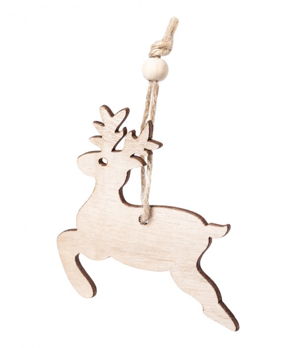 Set 3 ornamente din lemn pentru brad de Crăciun cu prindere din iută. Include forme de ren, stea și brad.