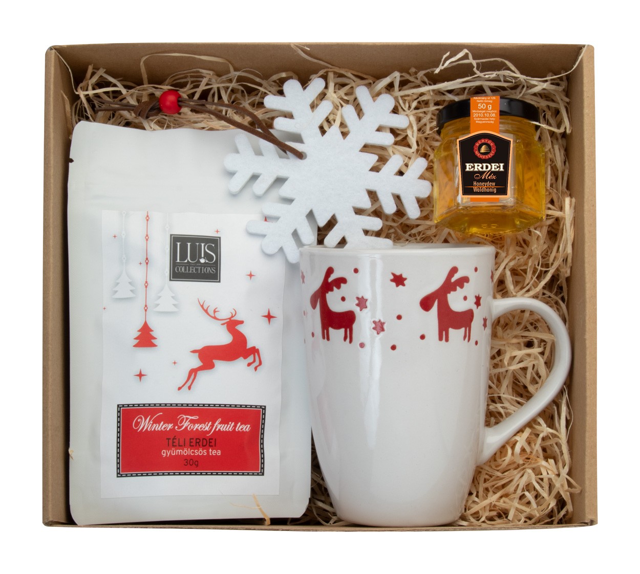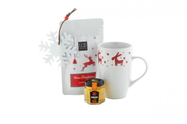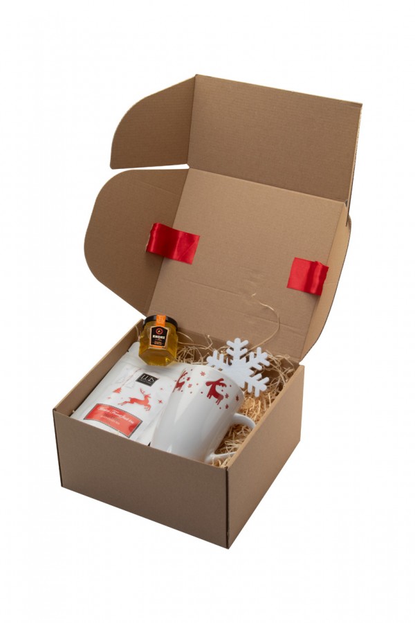 Set cadou cu ceai, în cutie cadou din carton kraft, cu umplutură de lână de lemn și panglică roșie. Include: cană de Crăciun "Lempaa"; Ceai de fructe de pădure „Luis” (30 g); Miere de pădure „Always Gourmet” (50g); Ornament „Fantezie” pentru brad