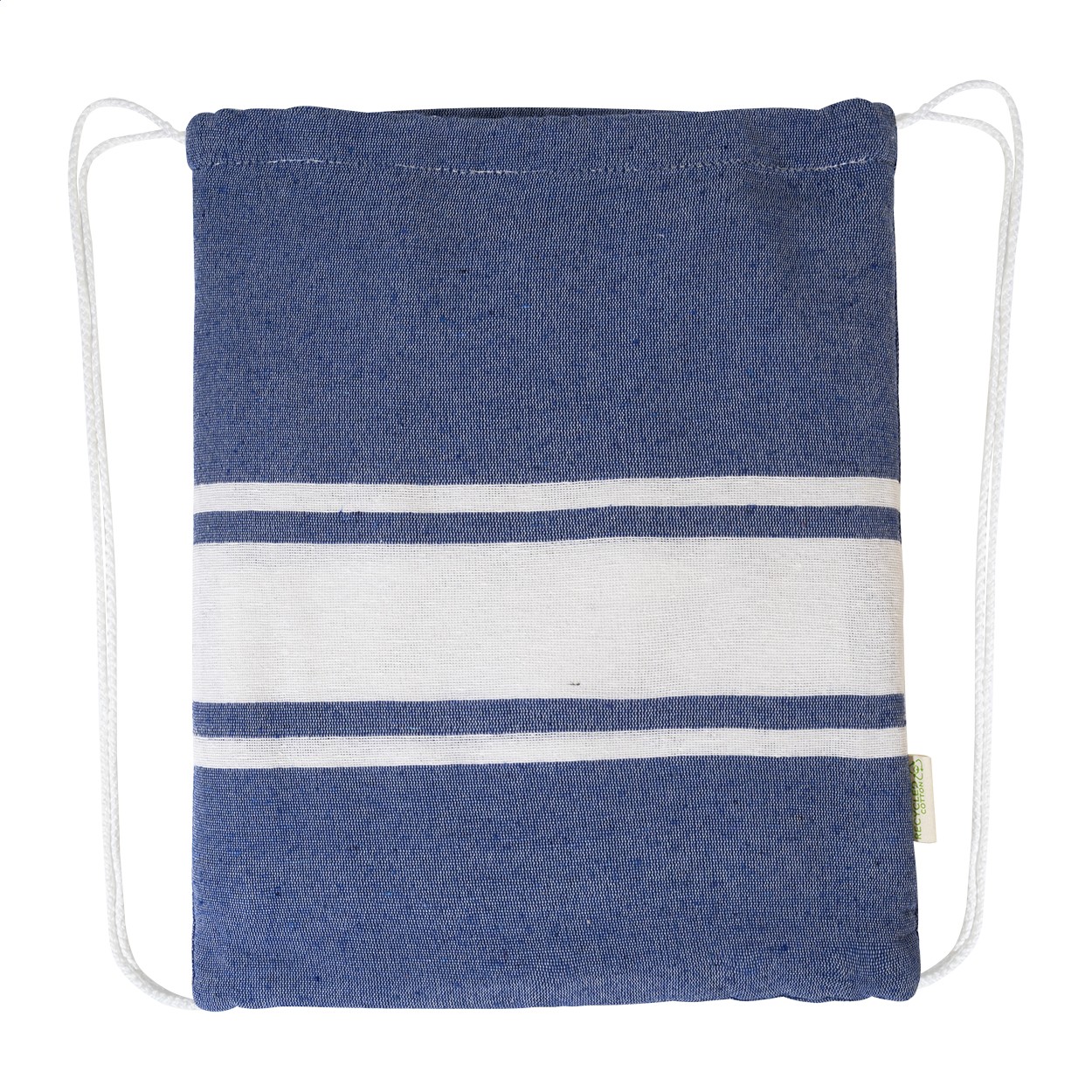 Prosop de plajă pareo, în două culori, cu sac integrat cu șnur. 70% bumbac reciclat și 30% poliester RPET, 180 g/m².