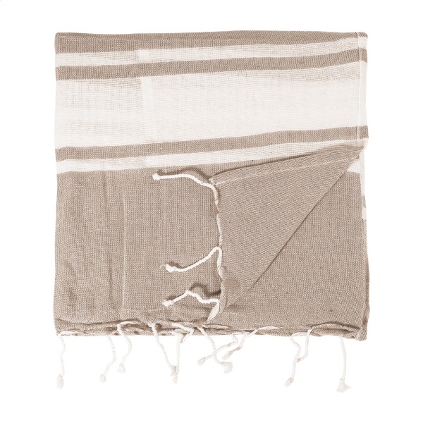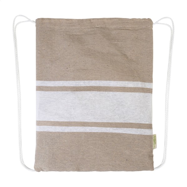 Prosop de plajă pareo, în două culori, cu sac integrat cu șnur. 70% bumbac reciclat și 30% poliester RPET, 180 g/m².