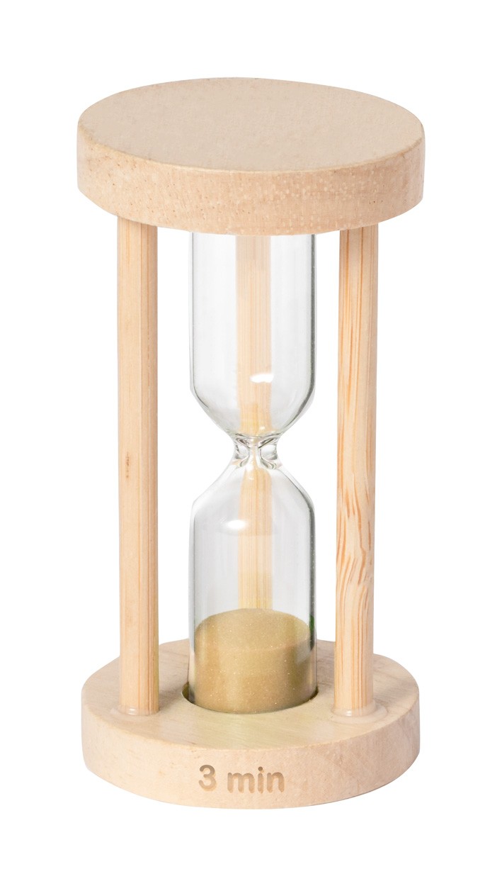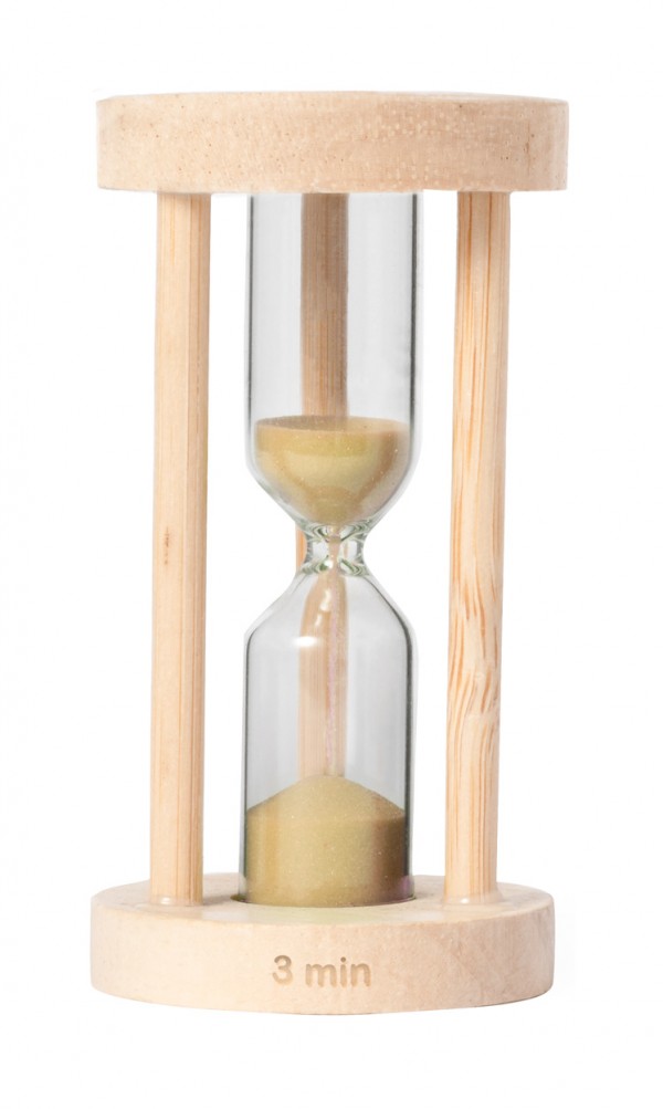 Clepsidră cu nisip, din sticlă borosilicată, de 3 minute, cu suport din lemn.