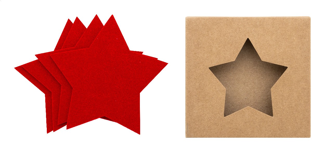 Set de 4 suporturi de pahare, de Crăciun, în formă de stea, din fetru RPET. În cutie de hârtie kraft.