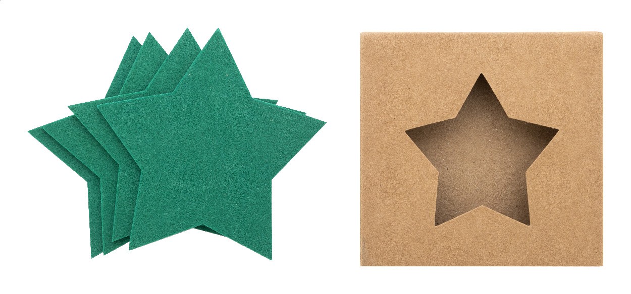 Set de 4 suporturi de pahare, de Crăciun, în formă de stea, din fetru RPET. În cutie de hârtie kraft.