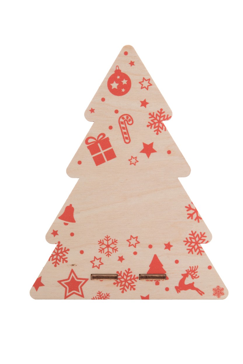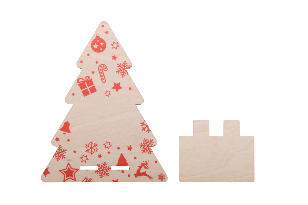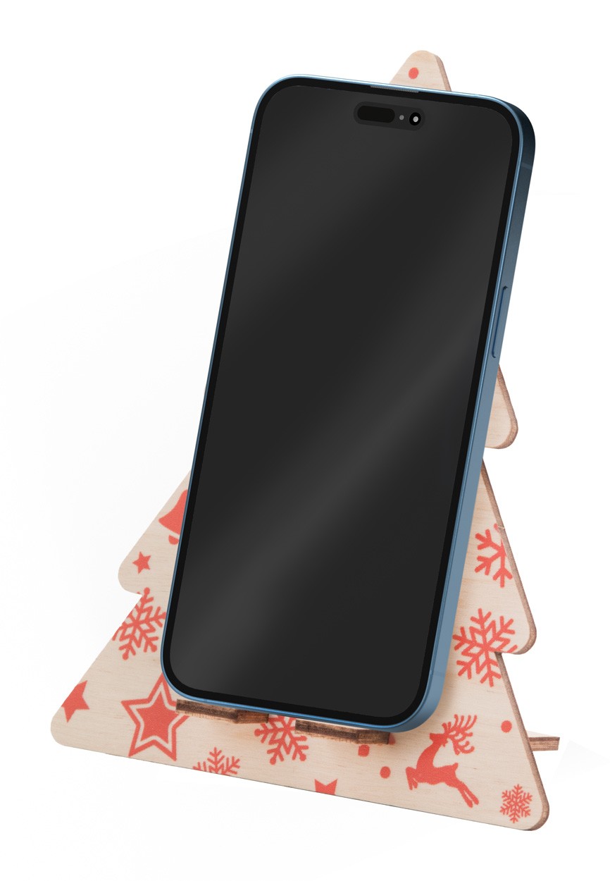 Suport pentru telefon mobil, de birou, in formă de brad, din placaj de mesteacăn. Livrat ambalat plat.