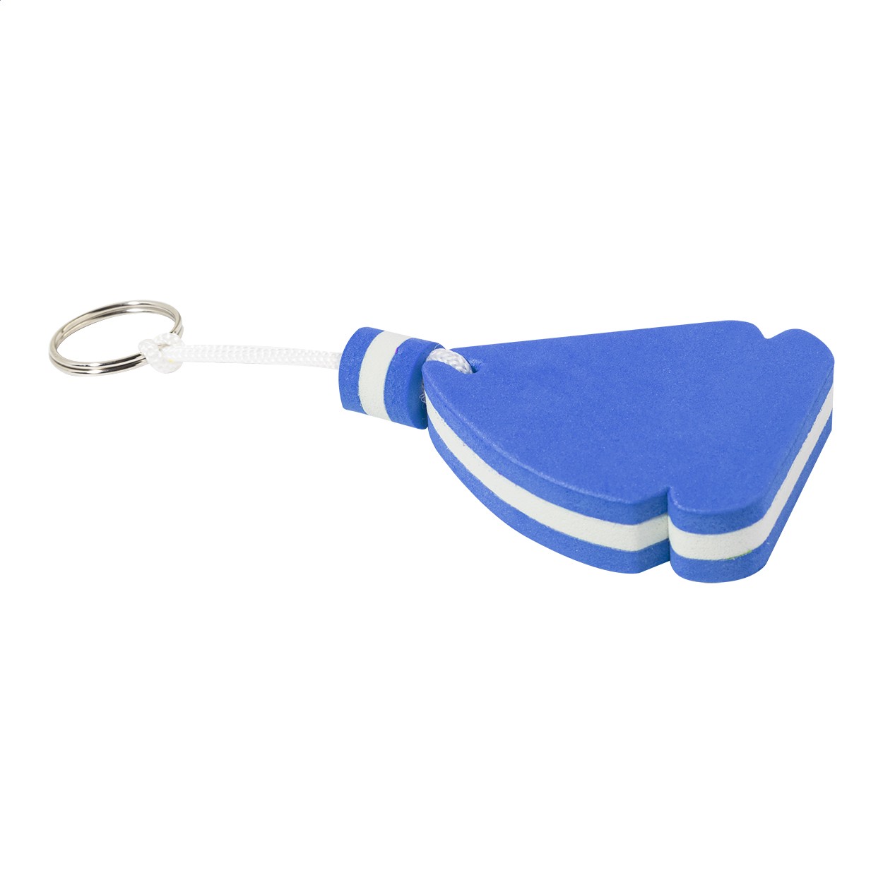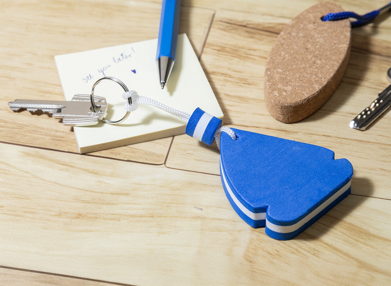 Breloc plutitor, din spumă EVA, în formă de barcă cu pânze, cu inel metalic.