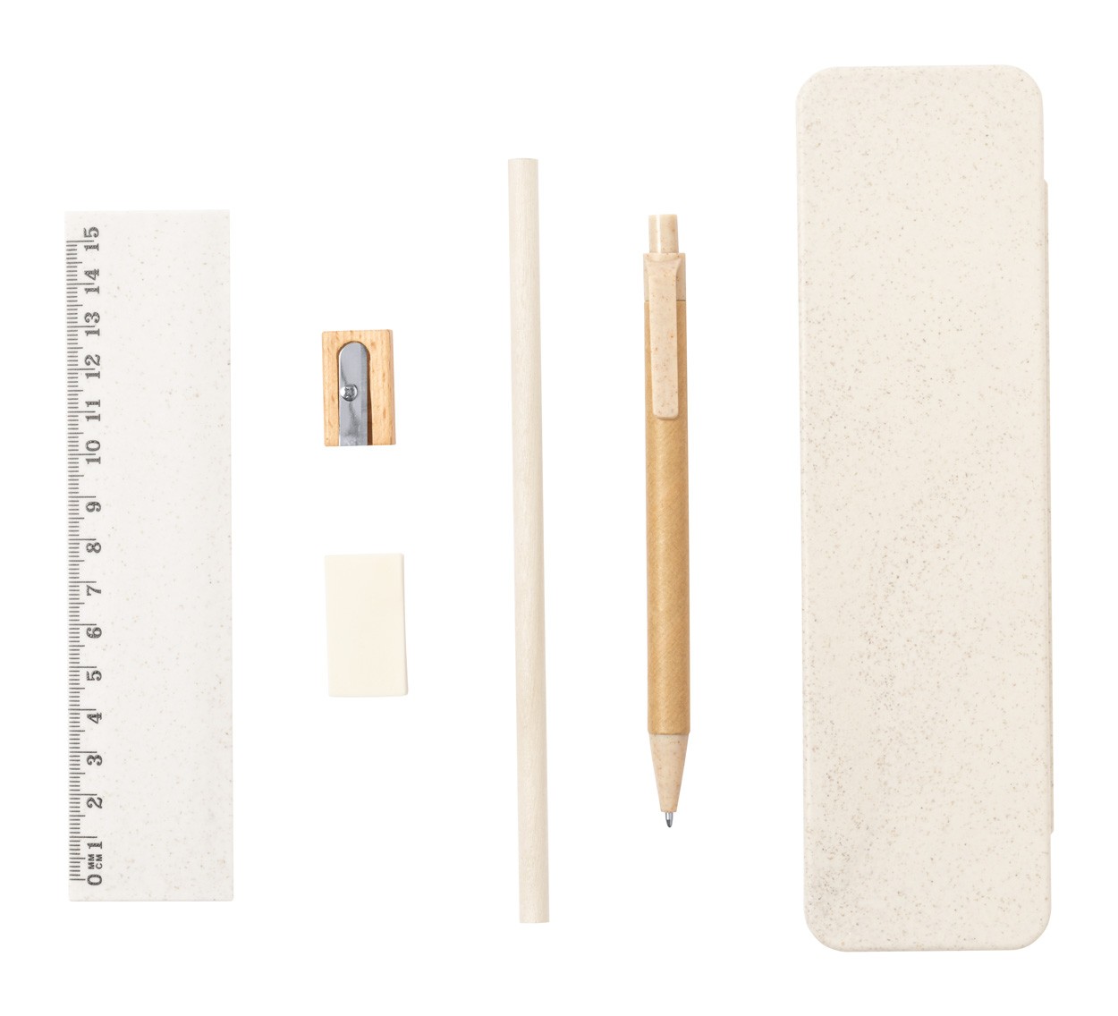 Set pentru scris, 5 buc, în cutie de palstic din paie ecologice de grâu. Inclusiv creion din lemn, hârtie reciclată și pix din plastic din paie de grâu cu reumplere albastră, riglă de 15 cm, ascuțitoare din lemn și radieră.