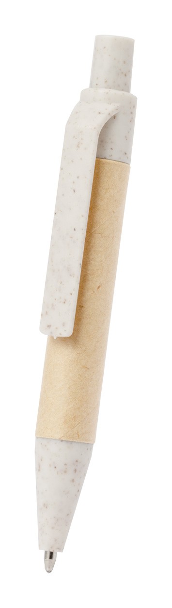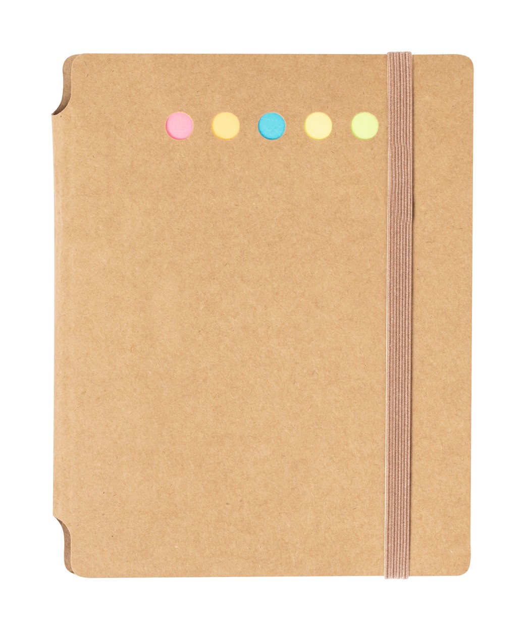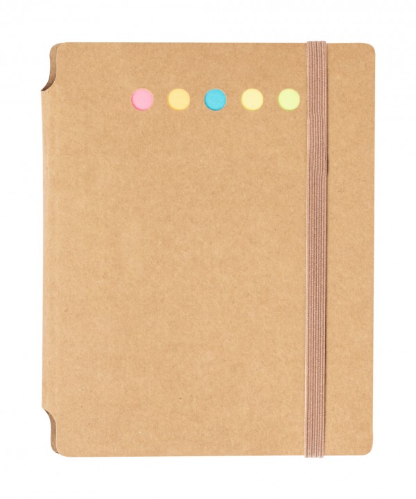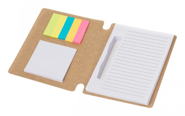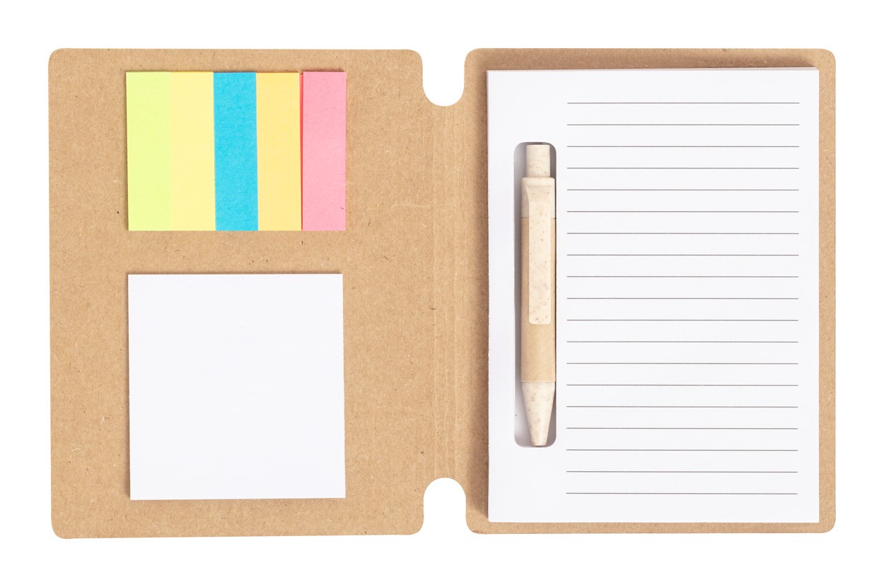 Recycled cardboard covered spiral notebook with 70 lined sheets, 15 sticky notes and 75 page markers (in 4 colours). Including recycled cardboard and wheat straw plastic ballpoint pen with blue refill.