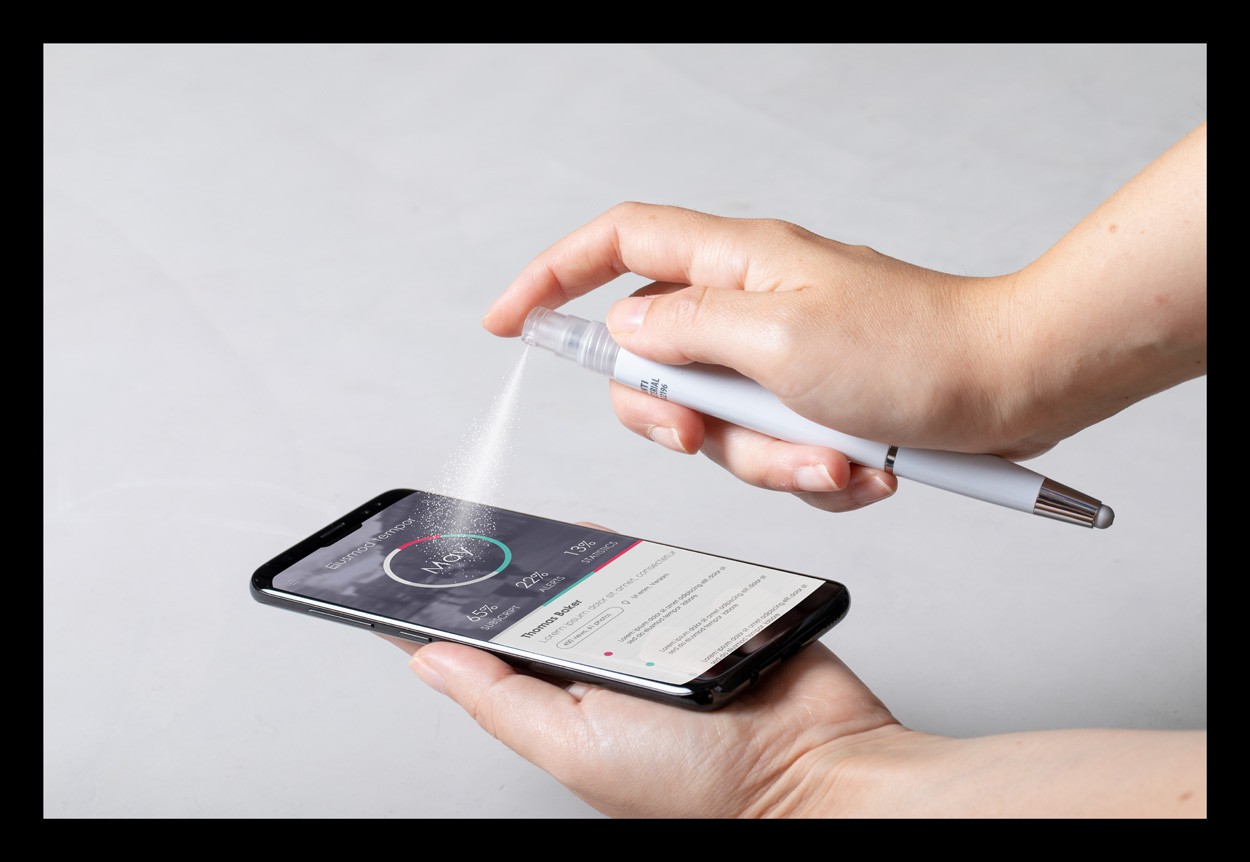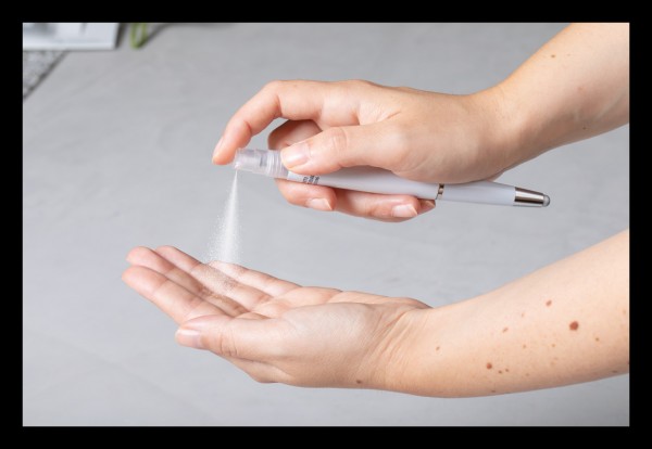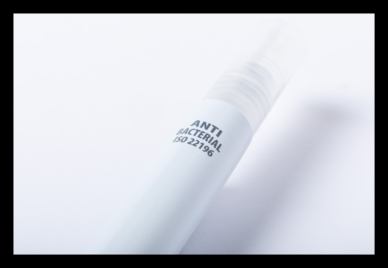 Pix din plastic antibacterian, cu mina albastra si spray de 3 ml. Se livreaza fara dezinfectant. Conform ISO 22196.