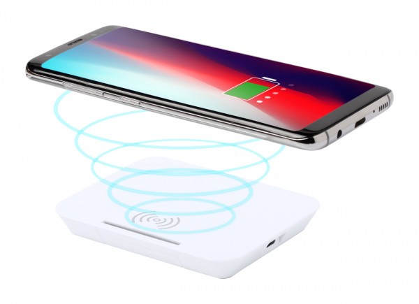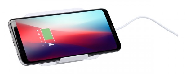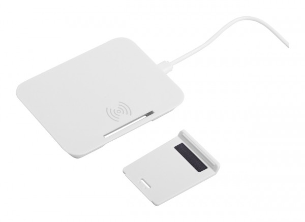 Încărcător wireless în carcasă din plastic cu funcție de suport telefon mobil. Putere max: 1000 mA. Cablul USB inclus.