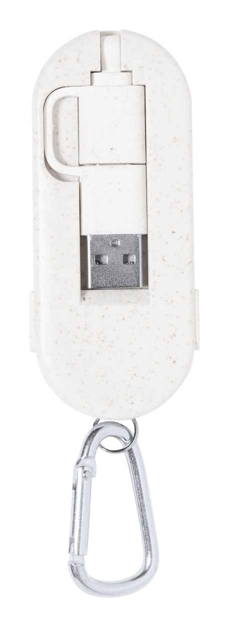 Cablu de încărcare USB telescopic cu carabină, din plastic din paie de grâu si carcasă din bambus. Cu conectori micro USB, USB-C și Lightning. Cu intrări USB și USB-C.