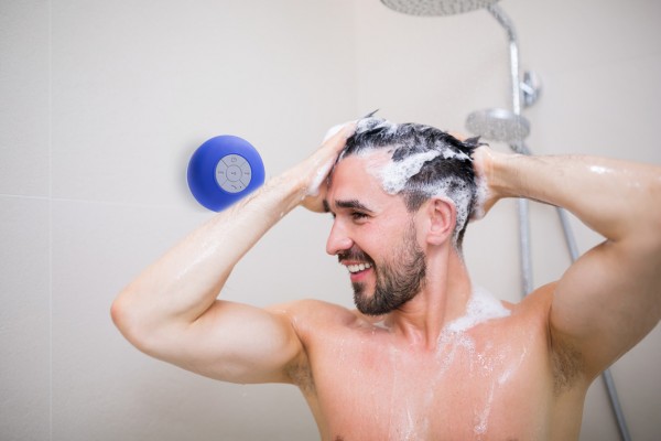 Difuzor wireless cu carcasă acoperită cu cauciuc și ventuză mare. Cu funcție de apelare mâini libere și baterie reîncărcabilă încorporată. Inclusiv cablu de încărcare USB.