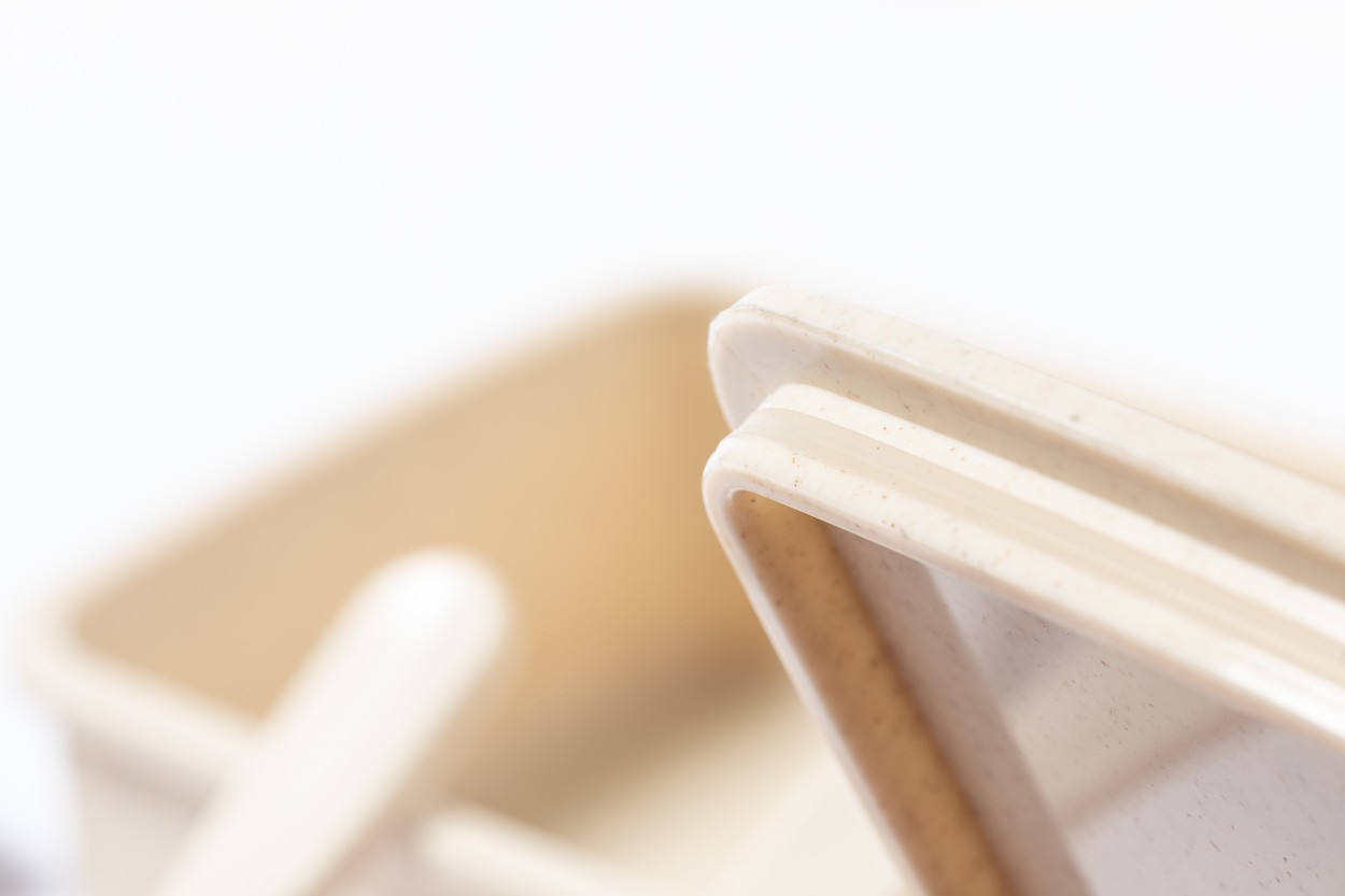 Cutie de prânz din plastic PP cu set de tacâmuri (cuțit și furculiță) și curea elastică. 700 ml.