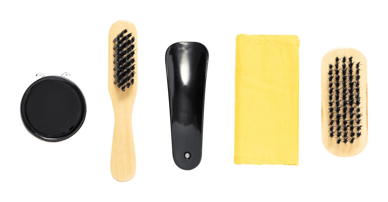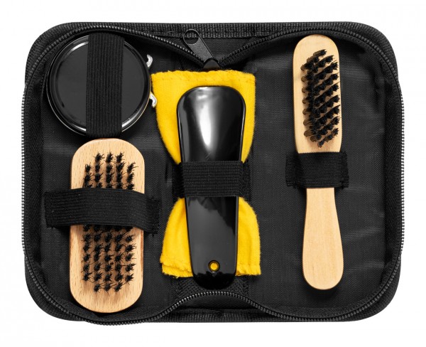 Set de 5 bucăți pentru lustruirea pantofilor, în carcasă din poliester RPET, cu fermoar.