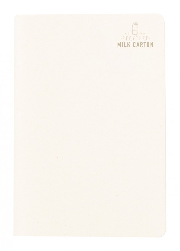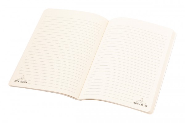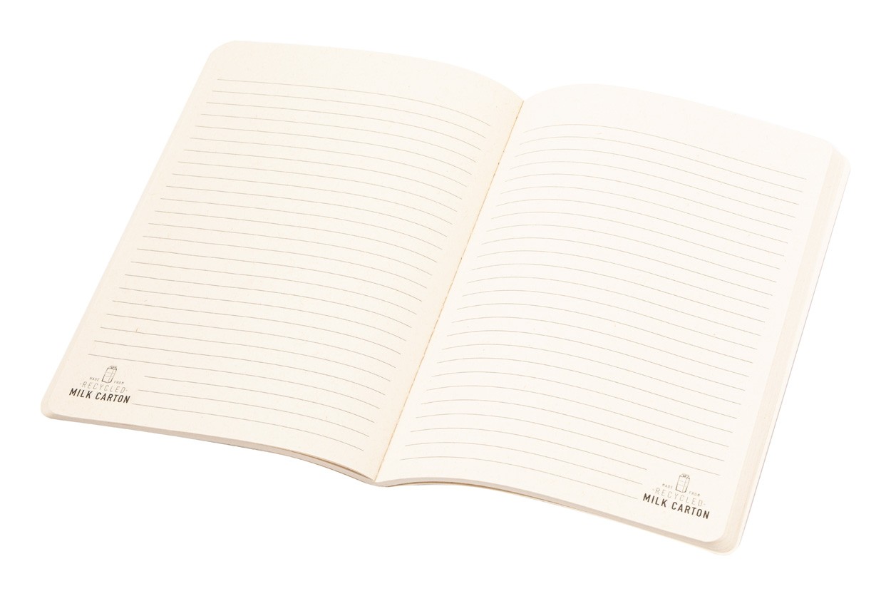Recycled milk carton covered notebook with 60 lined sheets, A5 size.