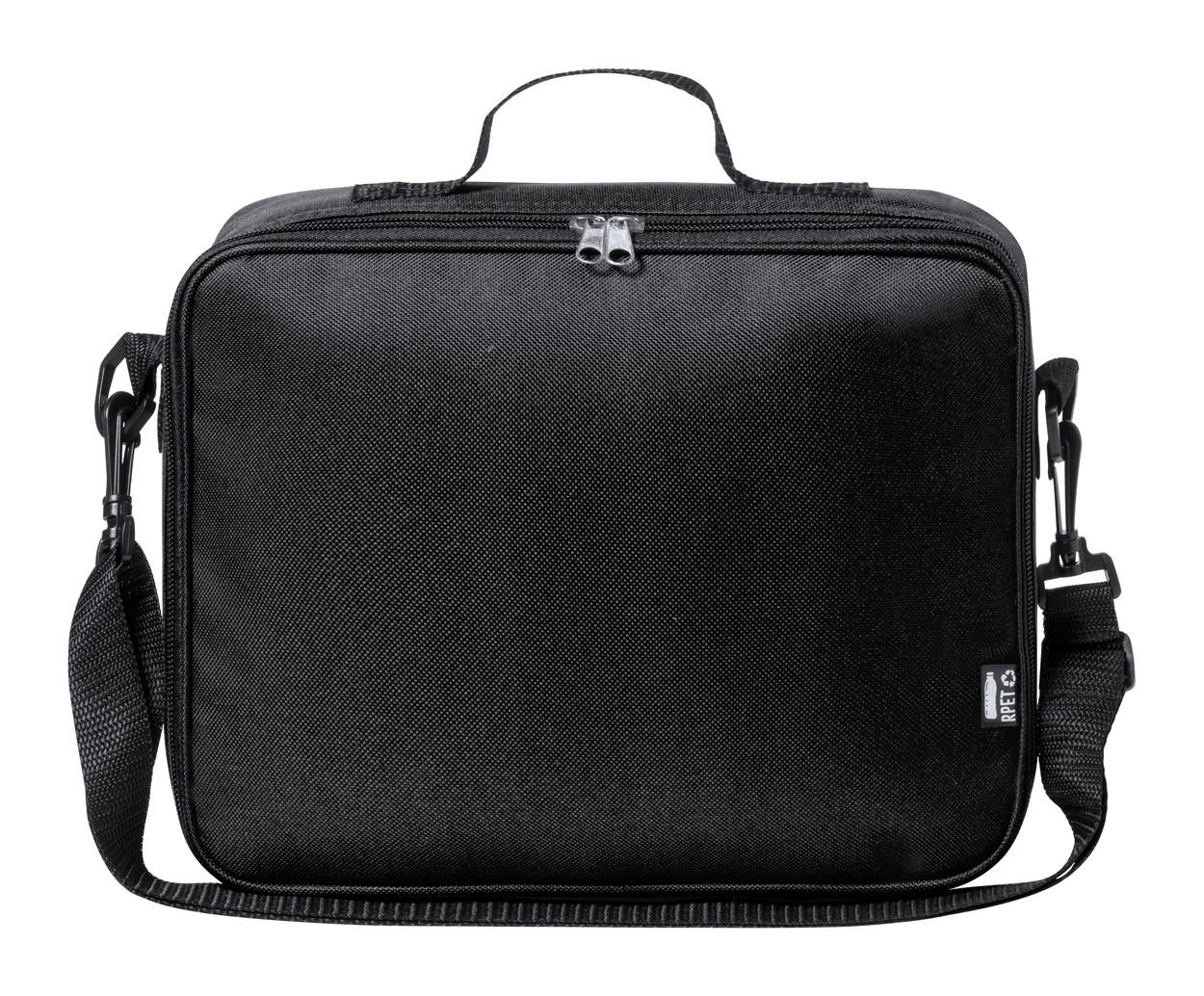 Geantă frigorifică din poliester 600D RPET cu compartiment principal cu fermoar, căptușeală din aluminiu, curea de umăr reglabilă și mâner. Cu etichetă distinctivă RPET.