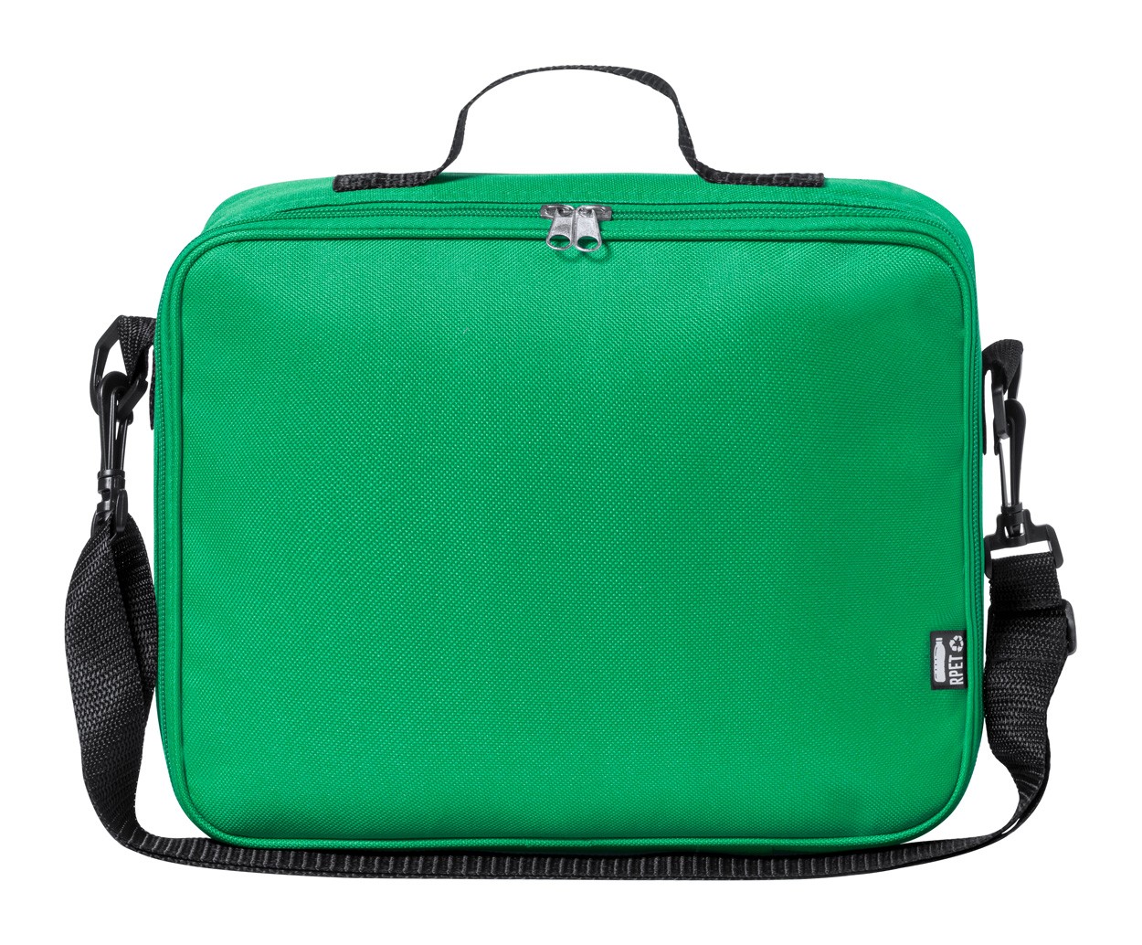 Geantă frigorifică din poliester 600D RPET cu compartiment principal cu fermoar, căptușeală din aluminiu, curea de umăr reglabilă și mâner. Cu etichetă distinctivă RPET.