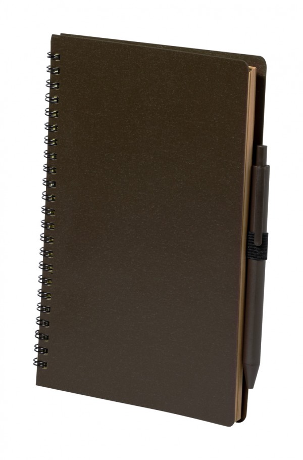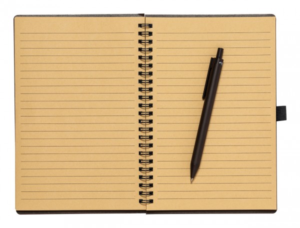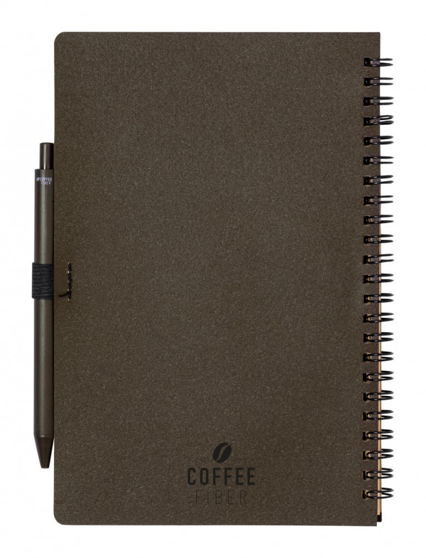 Caiet cu spirală, din plastic din fibre de cafea, cu 80 de foi dictando, dimensiune A5. Inclusiv un pix din plastic din fibre de cafea, cu mină albastră.