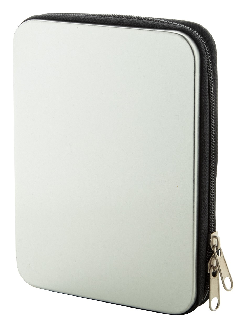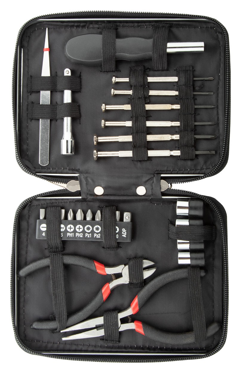 Set de scule din metal cu 25 piese în carcasă din aluminiu cu fermoar. Include: șpiț, clește de tăiere, șurubelniță, extender, penseta, 6 șurubelnițe de precizie, 10 buc set capete de șurubelniță, 4 buc cap șurub tubular.