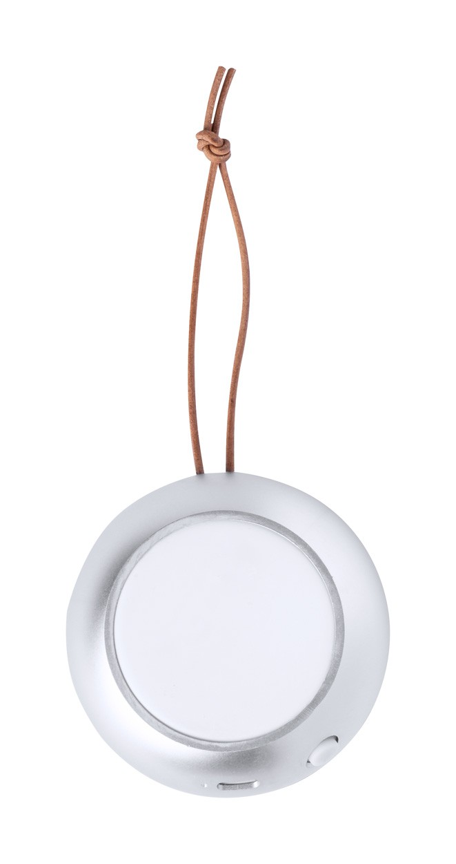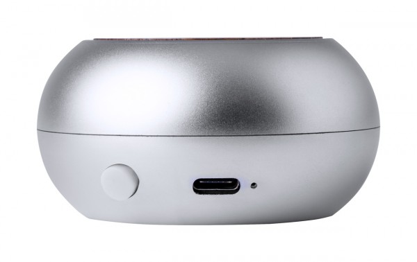 Difuzor wireless din aluminiu reciclat cu plasă din bambus și curea de transport din piele PU. Cu baterie reîncărcabilă încorporată. Inclusiv cablu de încărcare USB.