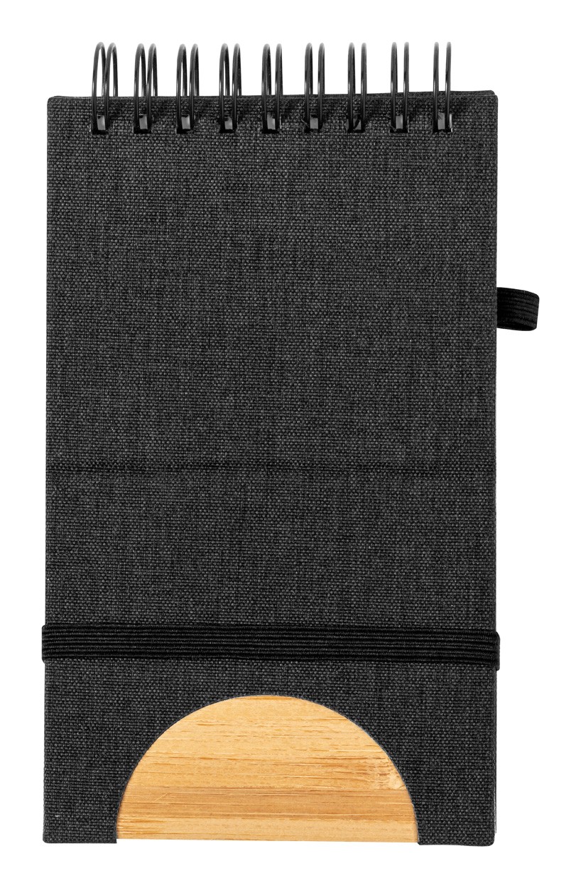 Caiet spiralat cu coperta din poliester RPET, cu inserție din bambus și funcție de suport mobil. Cu 80 de foi veline, curea de cauciuc și suport pentru pix.