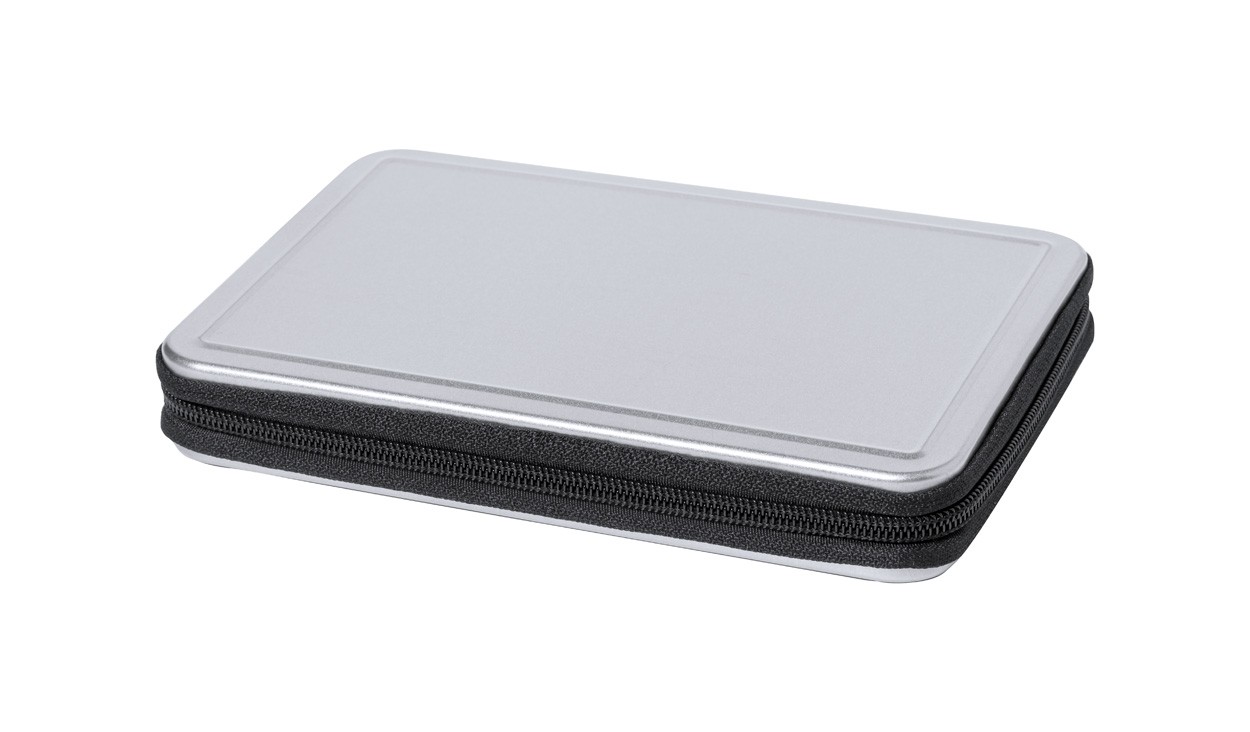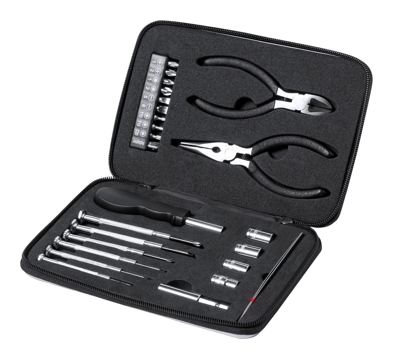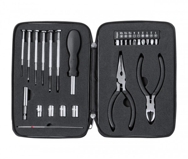 Set de scule din metal cu 25 piese în carcasă din aluminiu cu fermoar. Include: șpiț, clește de tăiere, șurubelniță, extender, penseta, 6 șurubelnițe de precizie, 10 buc set capete de șurubelniță, 4 buc cap șurub tubular.