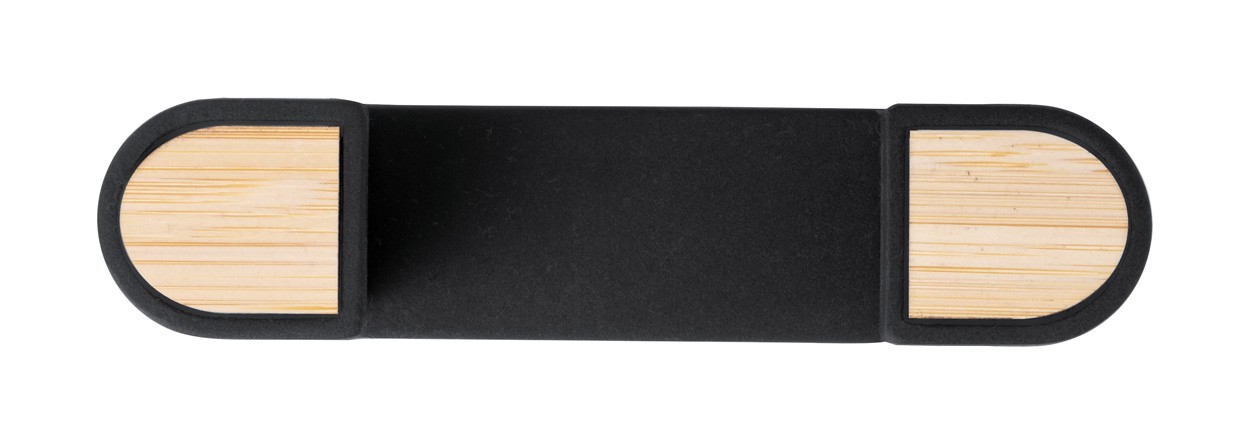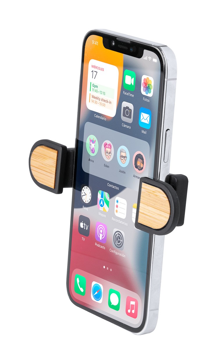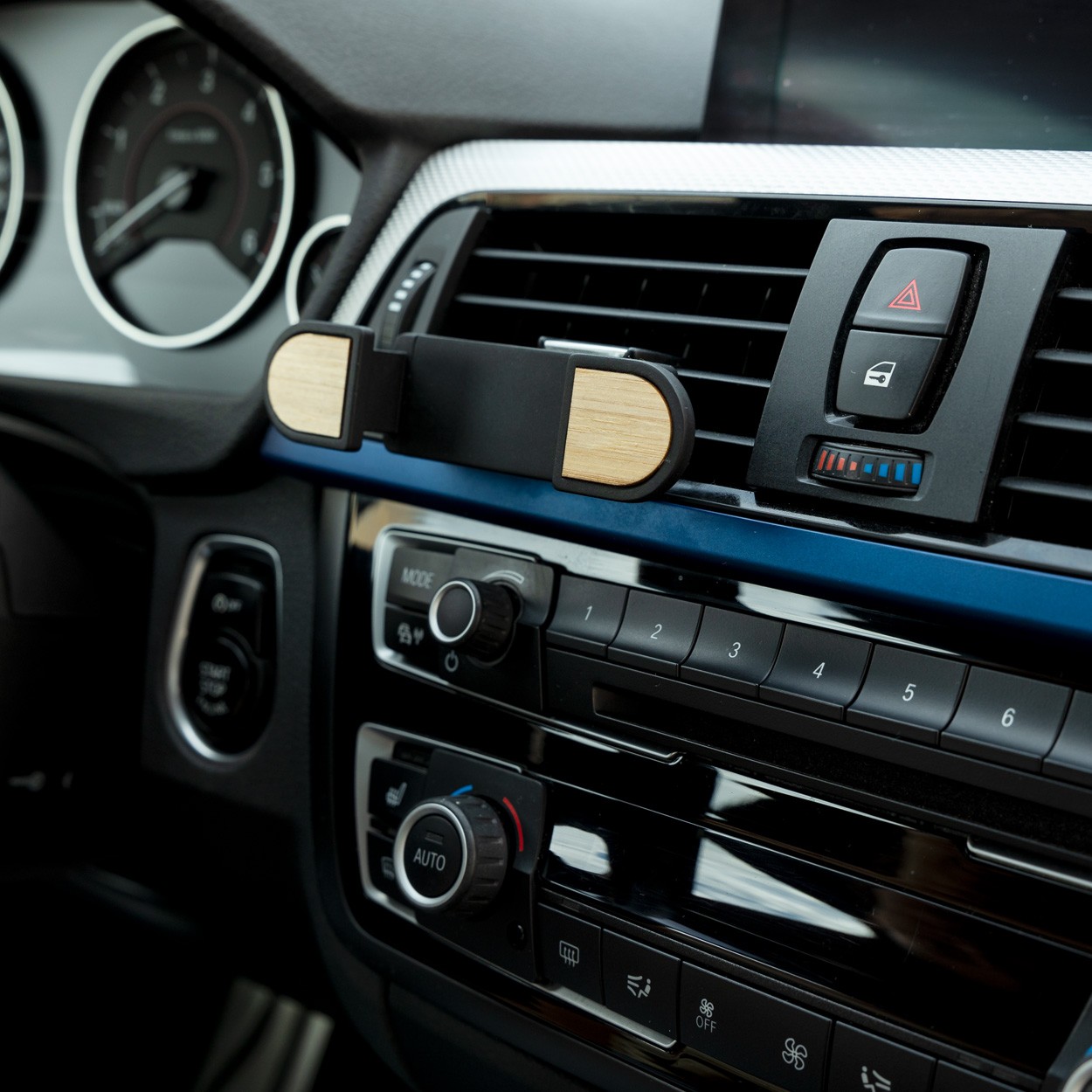 Adjustable car mobile holder with bamboo details and air vent mounting.