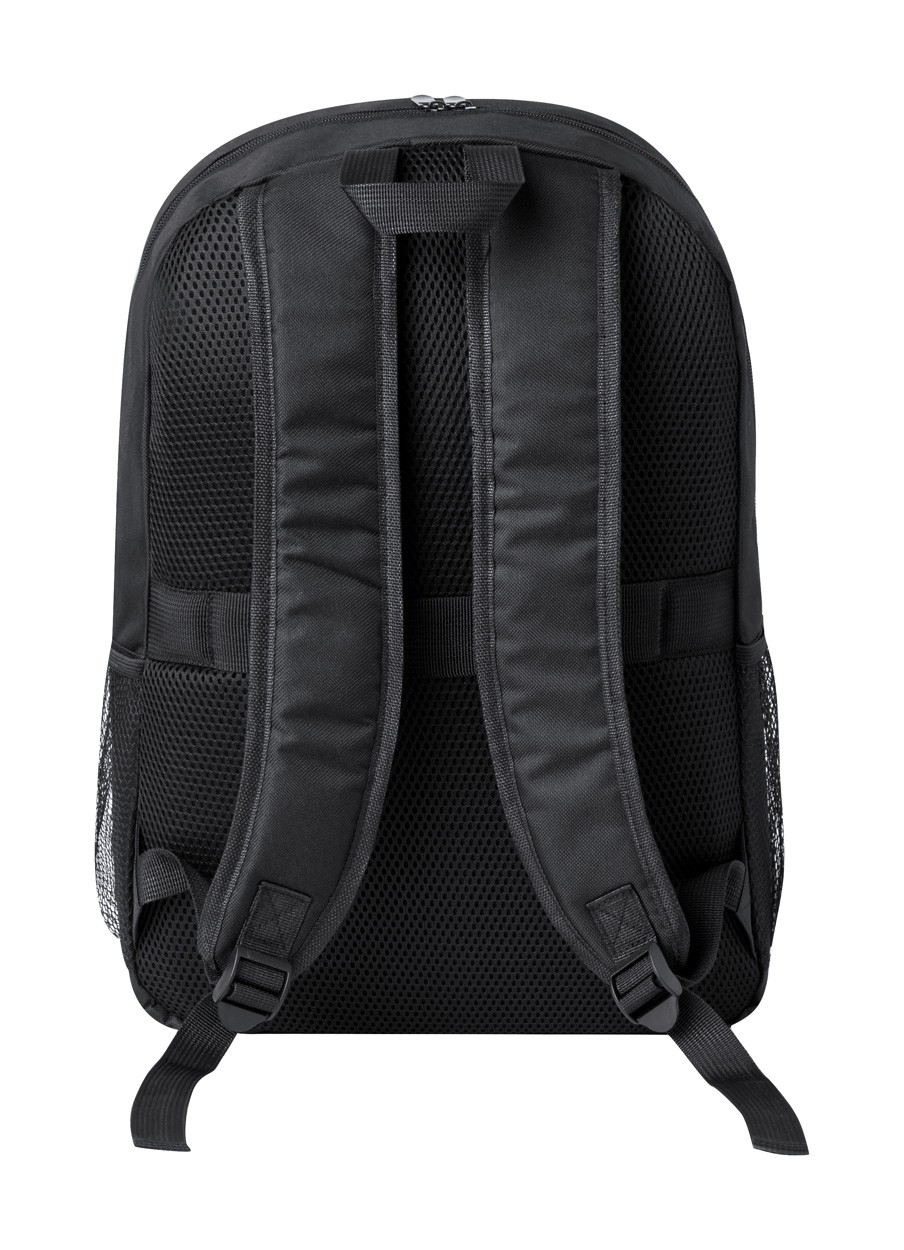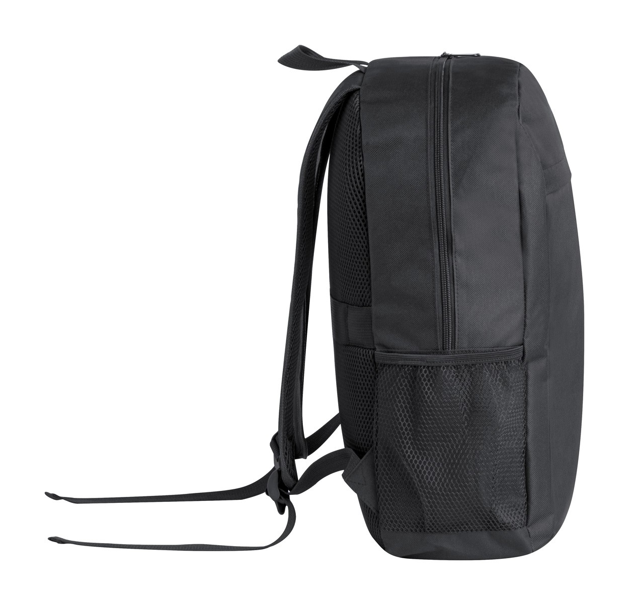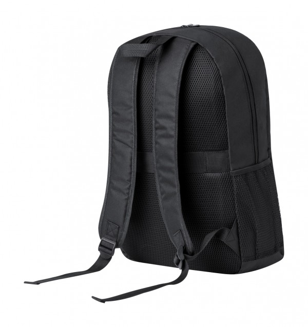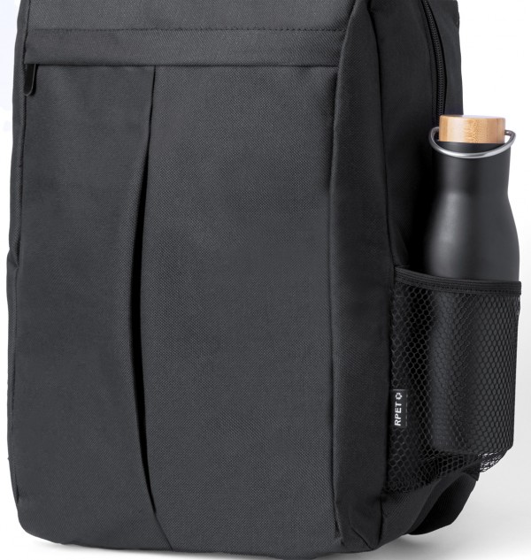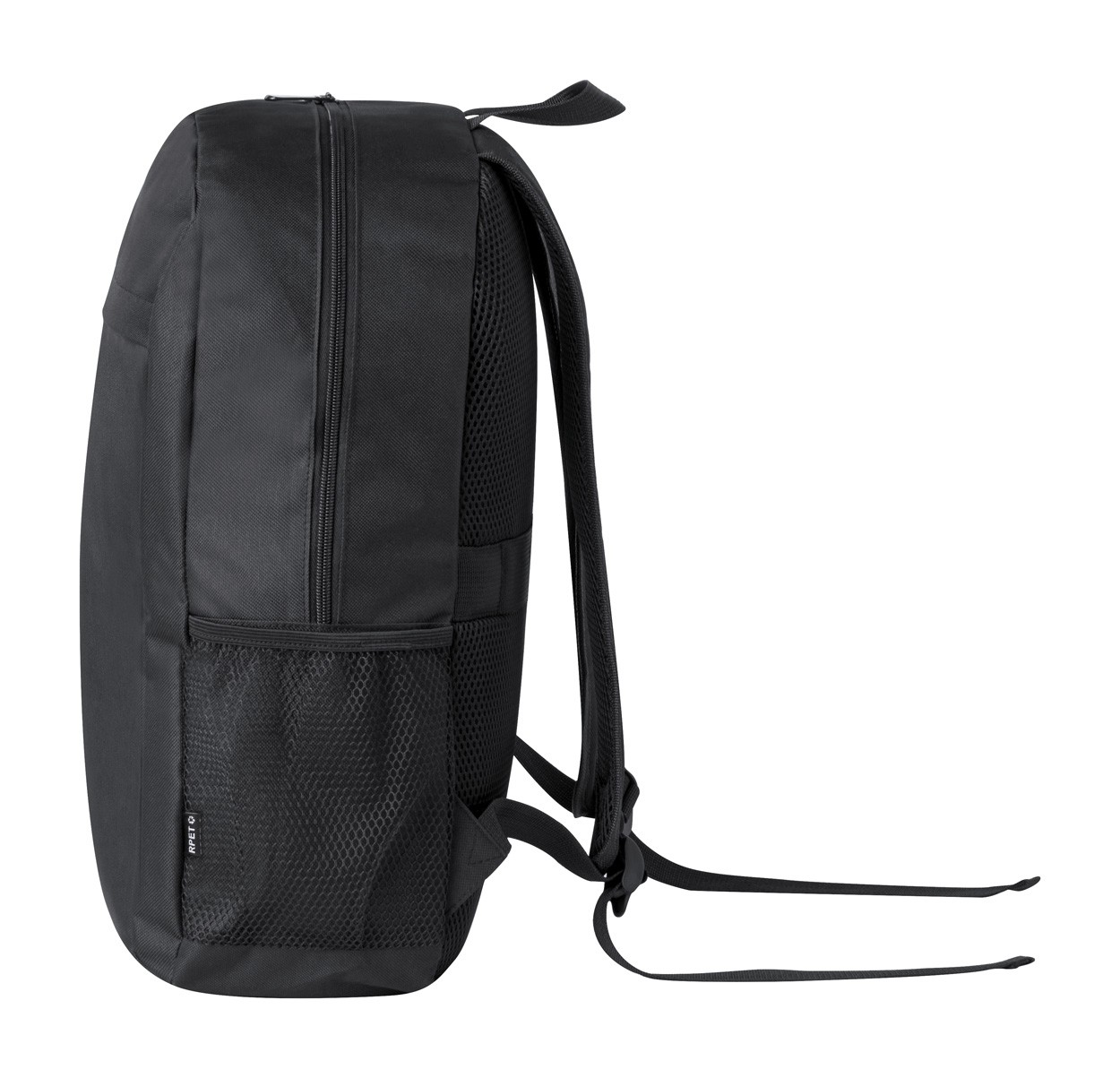 RPET backpack with zipped compartments, padded laptop (15") and tablet (10") compartment, side mesh pockets, padded back and shoulder straps. 600D RPET polyester with distinctive RPET label.