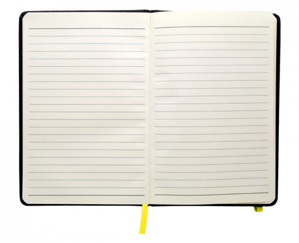 Carnețel A5 cu copertă din înlocuitor piele, cu semn de carte, bandă de cauciuc și suport pentru pix. 96 coli dictando.