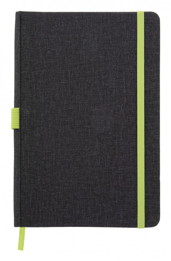 Carnețel A5 cu copertă din înlocuitor piele, cu semn de carte, bandă de cauciuc și suport pentru pix. 96 coli dictando.